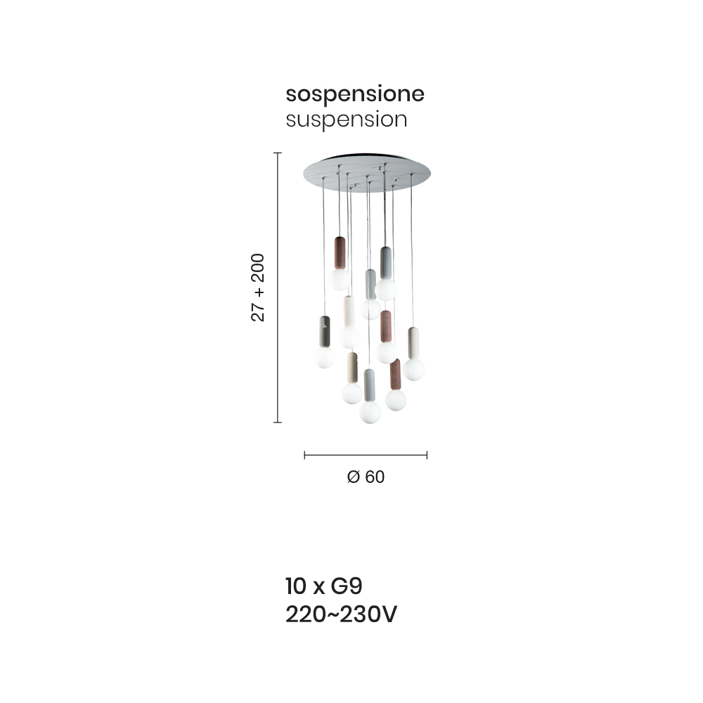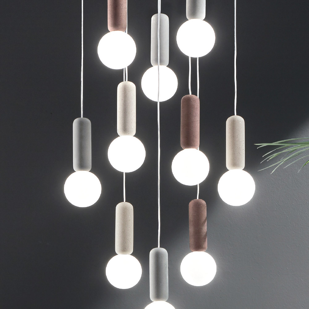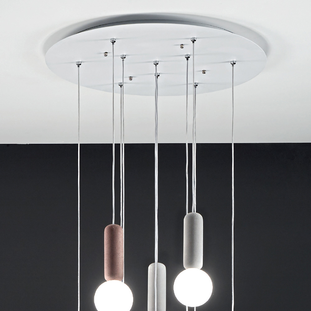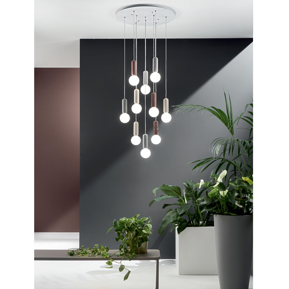 Pendelleuchte mit 6 oder 10 Leuchten mit Struktur aus Beton und rund Lampenschirme in weiß satiniertem Glas komplett mit Kabeln in der Länge verstellbar. Eine ungewöhnliche und kreative Kombination von Materialien und Oberflächen, die eine ebenso exzentrische wie elegante und moderne Einrichtungslösung zum Leben erwecken. Die wunderbaren Farbnuancen der Betonbauteile harmonieren perfekt mit dem zarten und romantischen Finish der Glasschirme für ein Ergebnis mit anspruchsvoller Ästhetik und starker visueller Wirkung . Seine Formgebung, die sich auf einem vertikalen Design entwickelt, macht es zu einer perfekten Einrichtungsidee, um Esszimmer, Wohnzimmer, Küchen oder Schlafzimmer mit einem zeitgenössischen Geschmack zu beleuchten und der Umgebung einen Hauch von einzigartigem Stil zu verleihen.