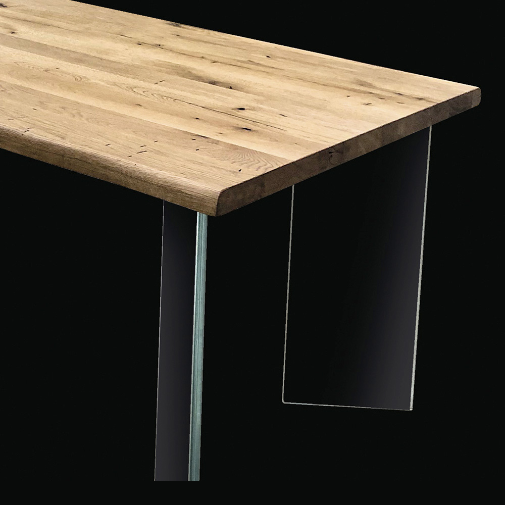 Tisch aus geknotetem, furniertem Eichenholz und Kristallsockel Made in Italy.