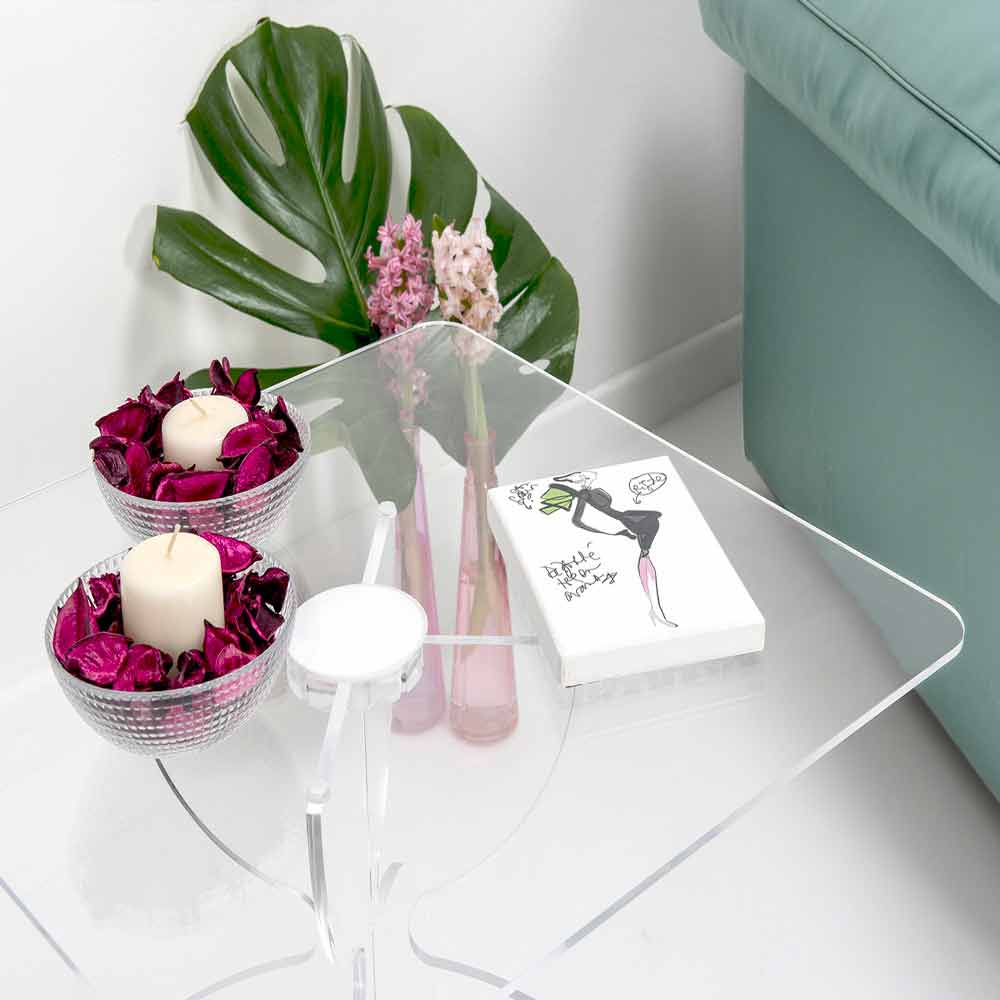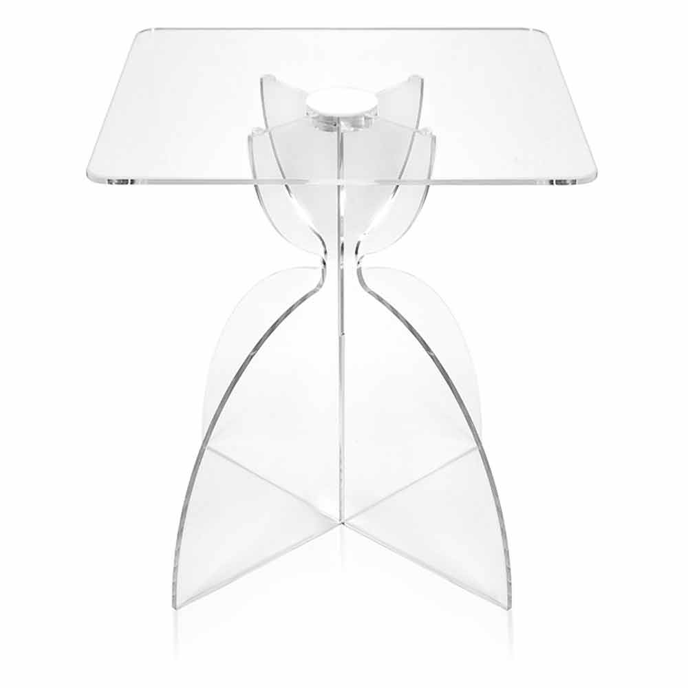 Quadratischer kleiner Tisch aus transparentem Plexiglas, Lamon Der quadratische kleine Tisch LAMON hat einen nordeuropäischen Ton. Der transparente, lasergeformte Plexiglasboden erinnert an den keltischen Stil und verleiht dem Wohnraum einen exotischen Hauch von Eleganz. Sowohl die Basis als auch die Oberfläche bestehen aus Acrylkristall-PMMA, das zu 100% aus jungfräulichem Polymer besteht. Die physikalisch-technischen Eigenschaften des Plexiglases (stoßfest, nicht verformbar, unveränderlich, wärmeisolierend) machen den kleinen Tisch sowohl im Innen- als auch im Außenbereich einsetzbar. Seine Helligkeit und Brillanz bleiben im Laufe der Zeit unverändert erhalten. Das verwendete PMMA-Plexiglas aus jungfräulichem Polymer ist ungiftig, hypoallergen, geruchlos und antibakteriell. 100% wiederverwertbar. Gedacht, entworfen und hergestellt in Italien mit italienischen Materialien.