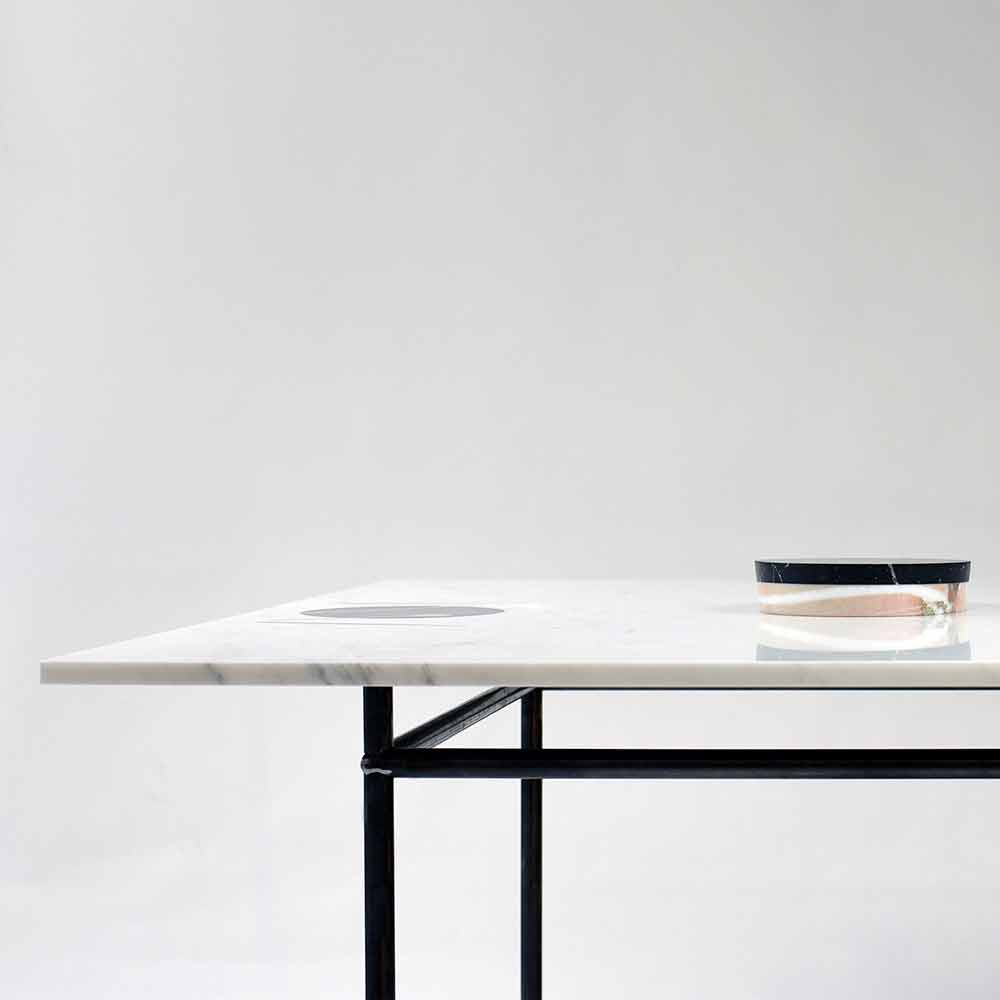 So entsteht ein originelles Einrichtungsaccessoire mit einer tiefgründigen Botschaft, das sich durch das Vorhandensein eines Lochs im zentralen Bereich der Platte auszeichnet, in das die erhabene Vase aus geschichtetem Marmor in verschiedenen Ausführungen eingesetzt werden kann.