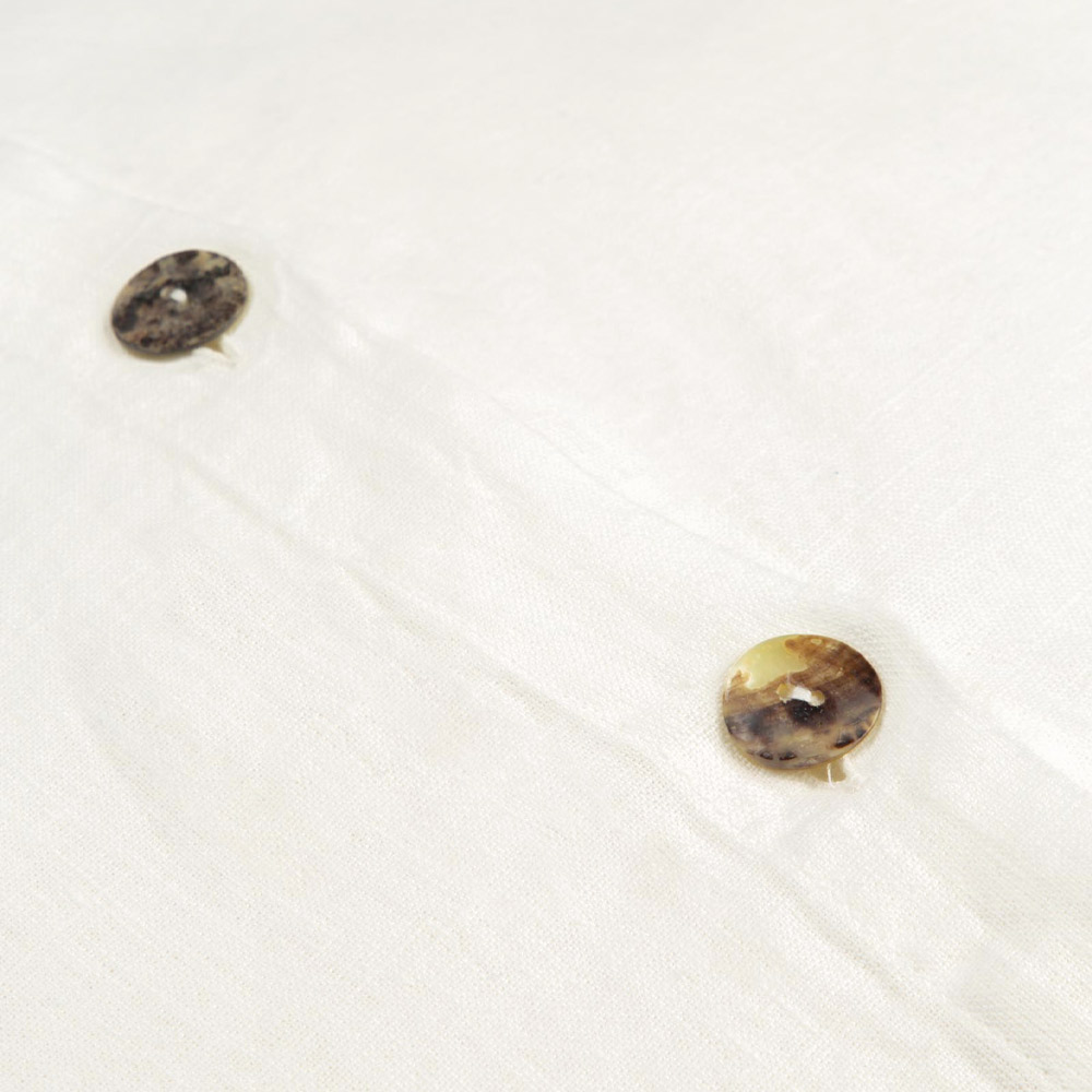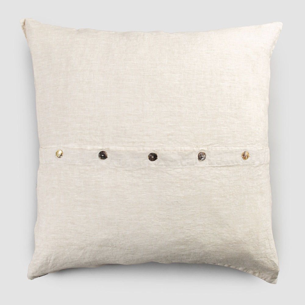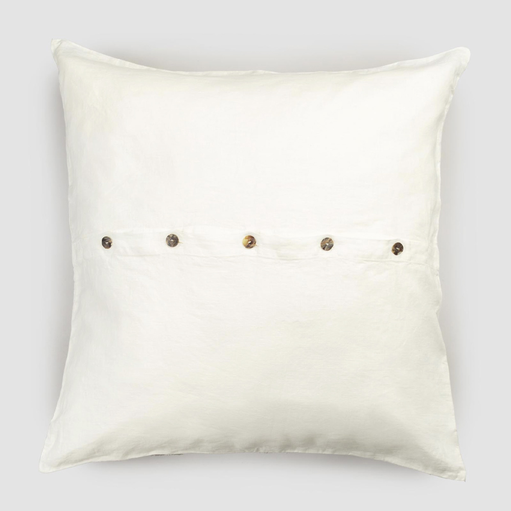 Der Wert der Tradition verbindet den modernen Lebensstil mit diesem schweren Leinen-Kissenbezug mit zentralem Verschluss und Agoya-Knöpfen aus Perlmutt für dekorative Kissen mit quadratischem Design.