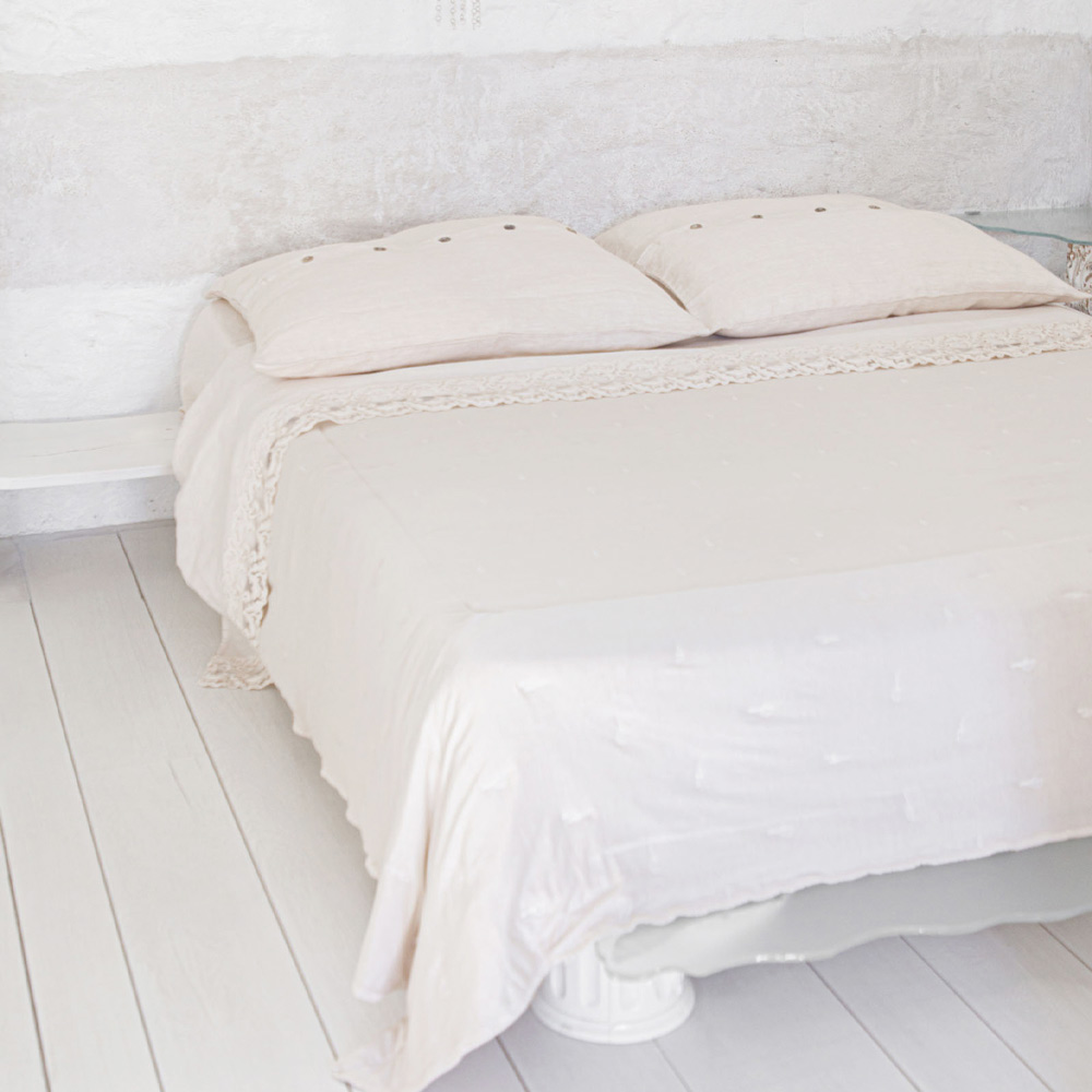 Durch die Liebe zum Detail und ein echtes Design , das auf die Essenz der Schönheit hinweist, entsteht ein authentisches und handwerkliches Produkt von höchster Qualität für die ausgewählten Rohstoffe wie reinstes Leinen und weichste Baumwolle. Die natürliche Unvollkommenheit des Materials kennzeichnet somit den Wert der Einfachheit , eingeschlossen in eine elegante und delikate Handwerkskunst für ein erhabenes und suggestives Sinneserlebnis