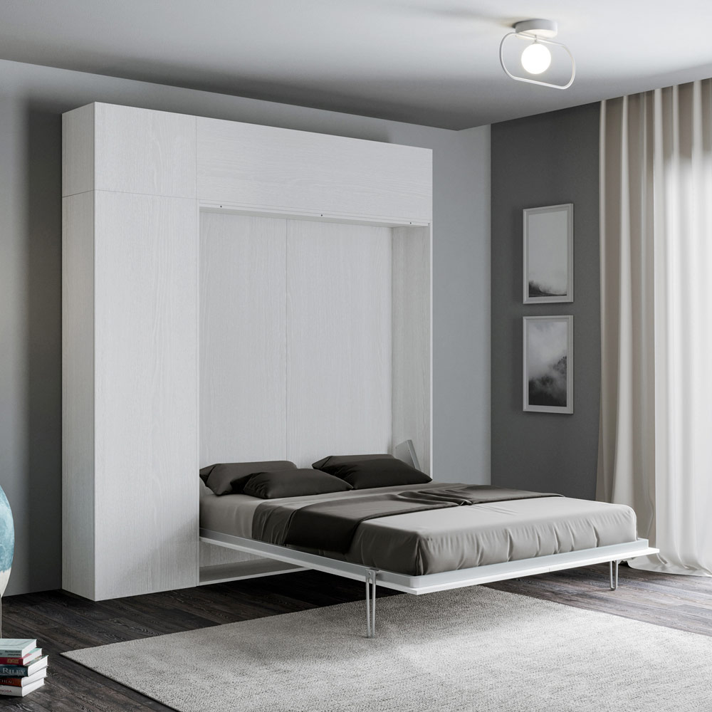 Der Bettrahmen besteht aus 18 mm dicken Melamin-Spanplatten und gewährleistet so Widerstandsfähigkeit und Langlebigkeit. Der Öffnungsmechanismus ist sanft und sicher und verwandelt die Wand mit einer einfachen Geste in ein bequemes Bett.