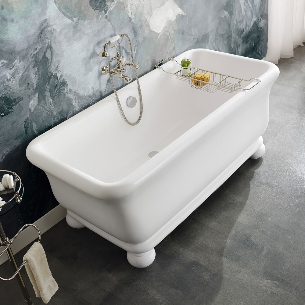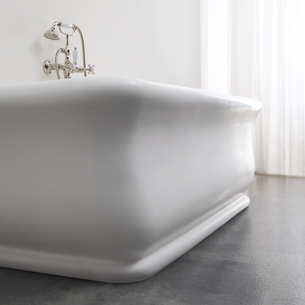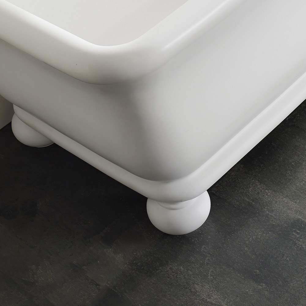 Rechteckige weiße Badewanne aus Solid Surface, einer Mischung aus mit mineralischen Verbindungen modifiziertem Acrylharz , mit Überlauf für die Ablaufsäule. Originale 4-Fuß- Hochbadewanne mit optionaler festerOberfläche . Wahlweise matt oder glänzend weiß. Durch die Zusammensetzungsmischung entsteht diese charakteristische Farbe. Diese Mischung ist außerdem hoch erneuerbar, homogen und 100 % porenfrei und daher wasserdicht.