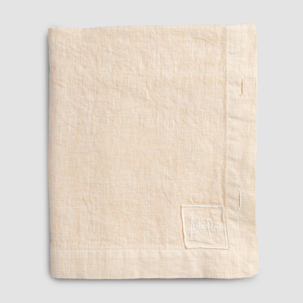 Der Wert der Tradition verbindet den modernen Lebensstil mit dieser schweren Leinentischdecke, die auf einer langen Seite mit einer Reihe von Agoya-Perlmuttknöpfen verziert ist.