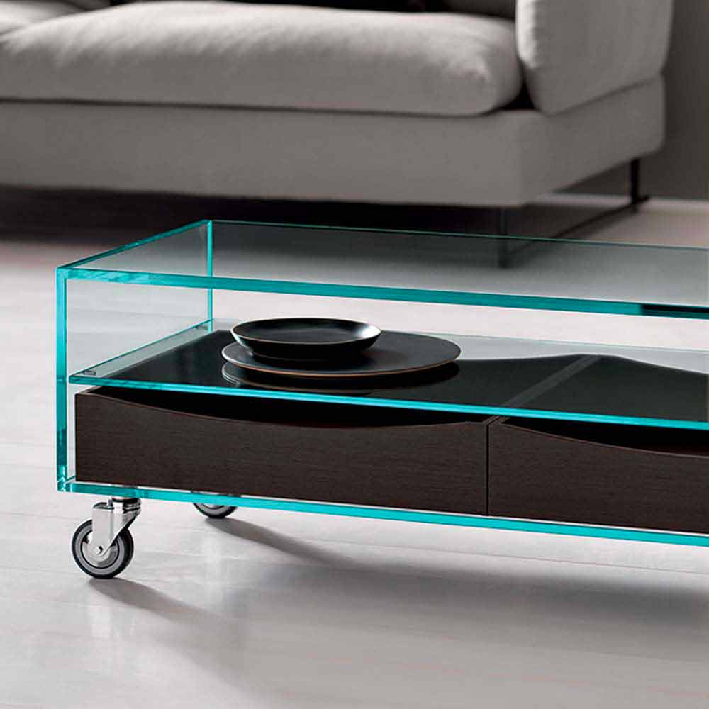 Wohnzimmer Couchtisch im modernen Stil auf Rädern aus extraklarem Glas mit zwei Schubladen aus Wengè-Holz, Made in Italy.