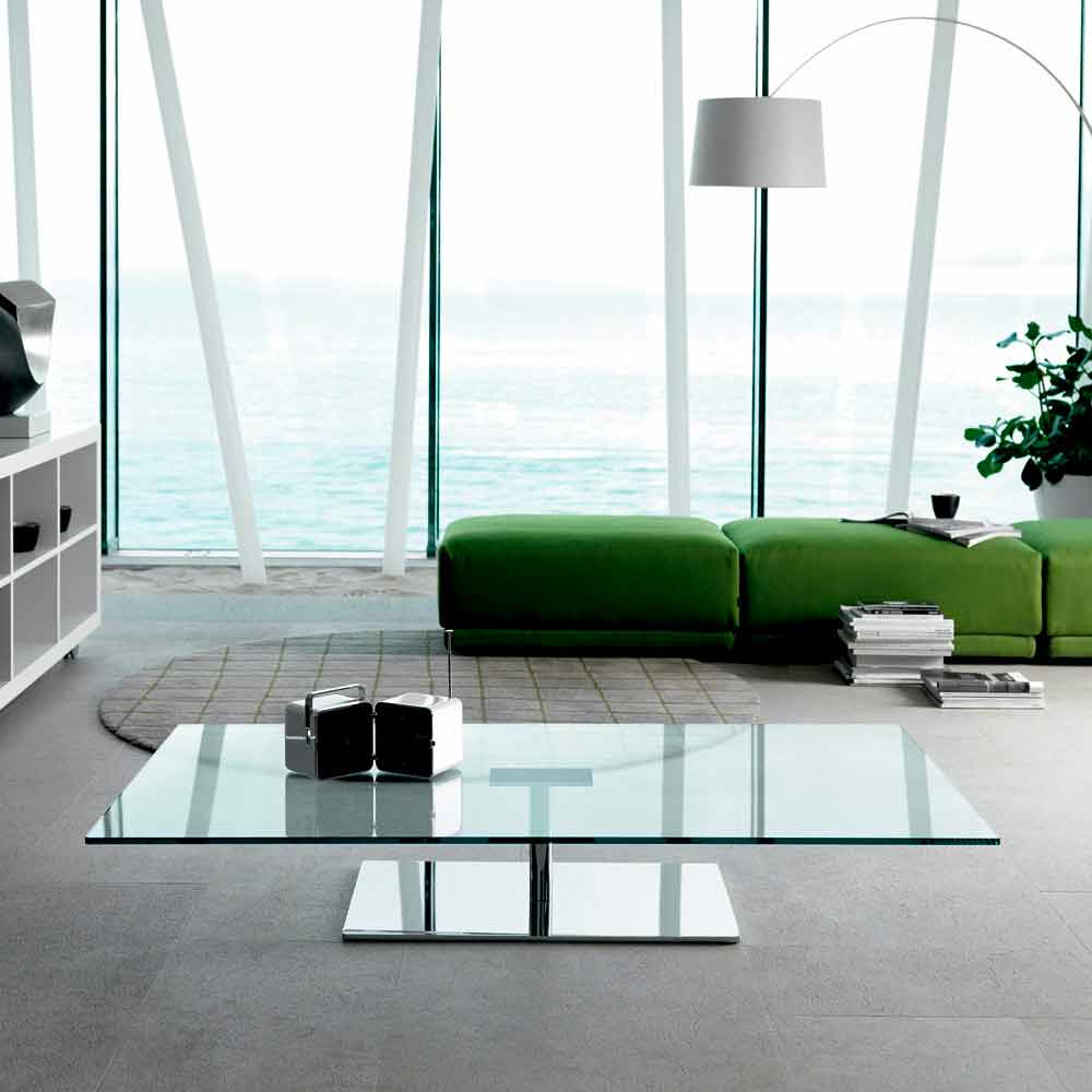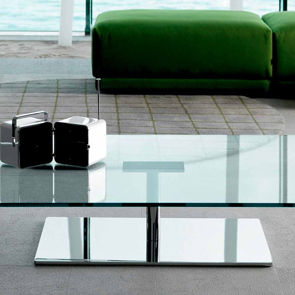Dieser niedrige Couchtisch für das Wohnzimmer im rechteckigen Design zeichnet sich durch die komplett aus Glas gefertigte Platte und einen Metallfuß in Chrom- oder Gunmetal-Optik aus, der wunderbare Licht- und dreidimensionale Effekte erzeugt.
