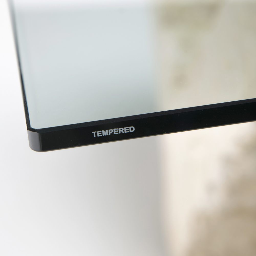 Couchtisch mit weißer Fossilsteinstruktur und 10 mm polierter Glasplatte.