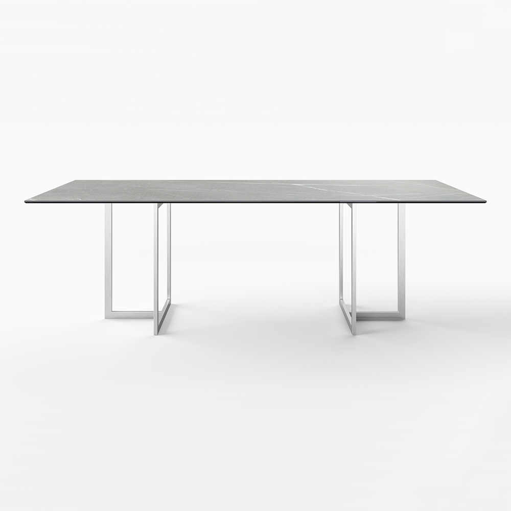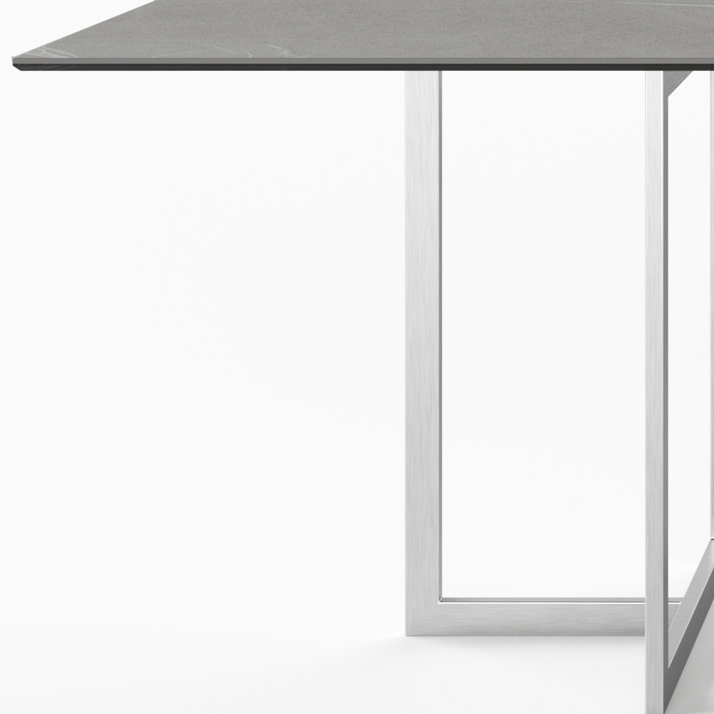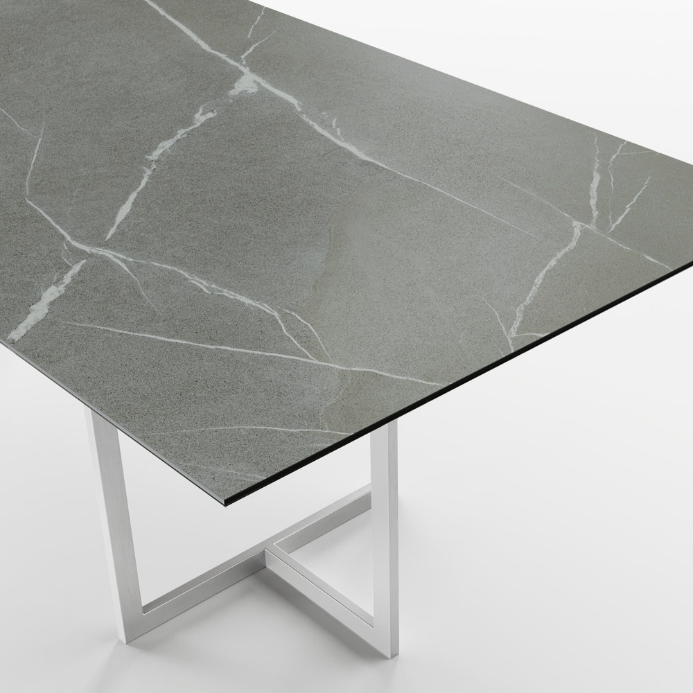 Esstisch aus Feinsteinzeug mit Steinoptik und Edelstahl Made in Italy.
