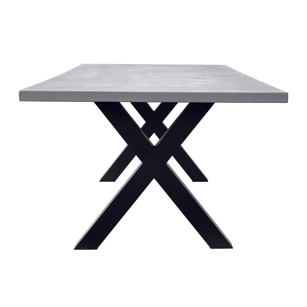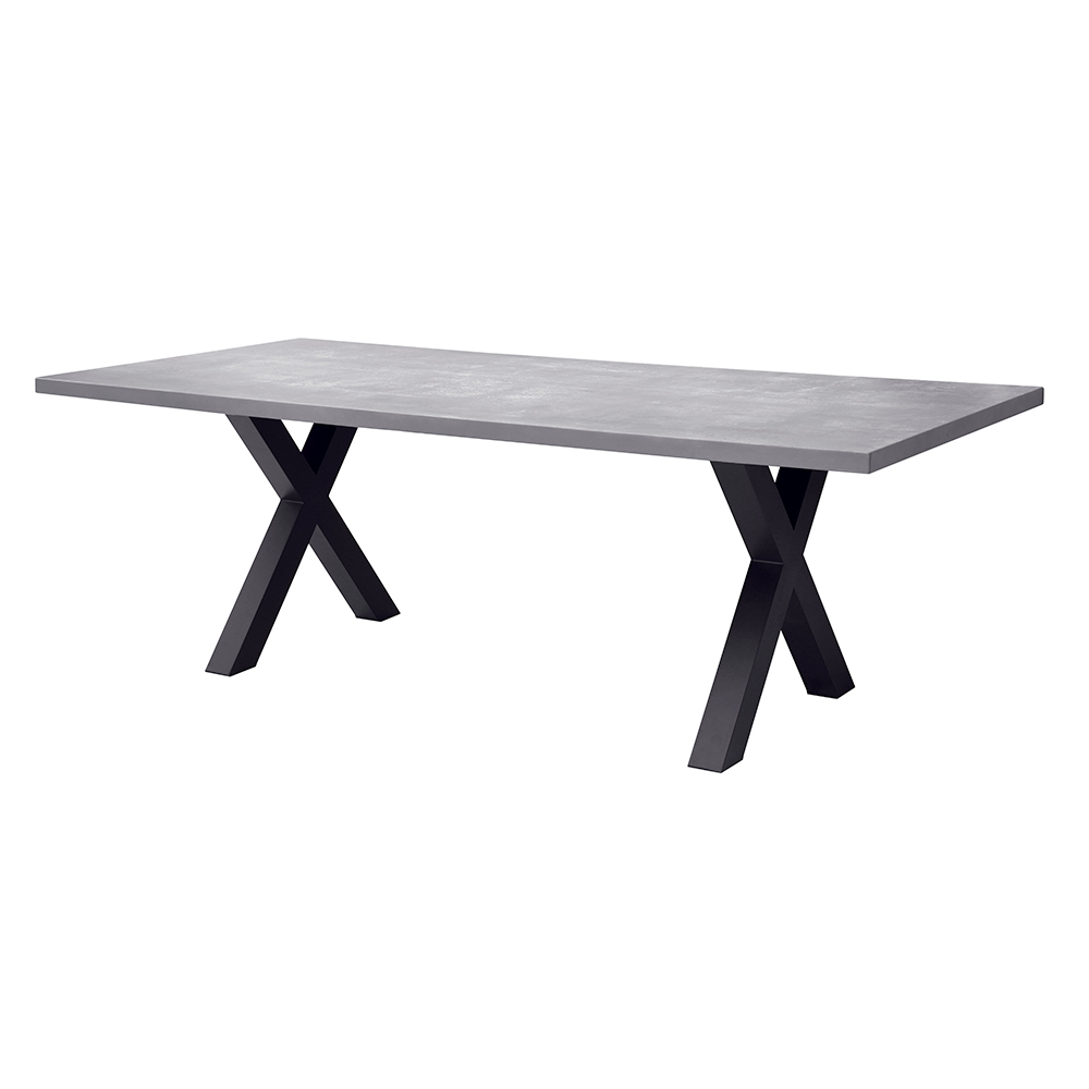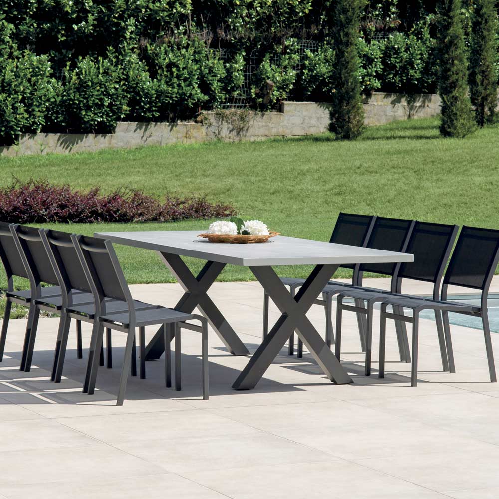 Die graue Harzplatte vereint Eleganz und Funktionalität und bietet eine strapazierfähige, pflegeleichte Oberfläche, die für alle Wetterbedingungen geeignet ist. Die gekreuzten Aluminiumbeine verleihen der Konstruktion ein dynamisches, modernes Aussehen und gewährleisten gleichzeitig Stabilität und Robustheit.