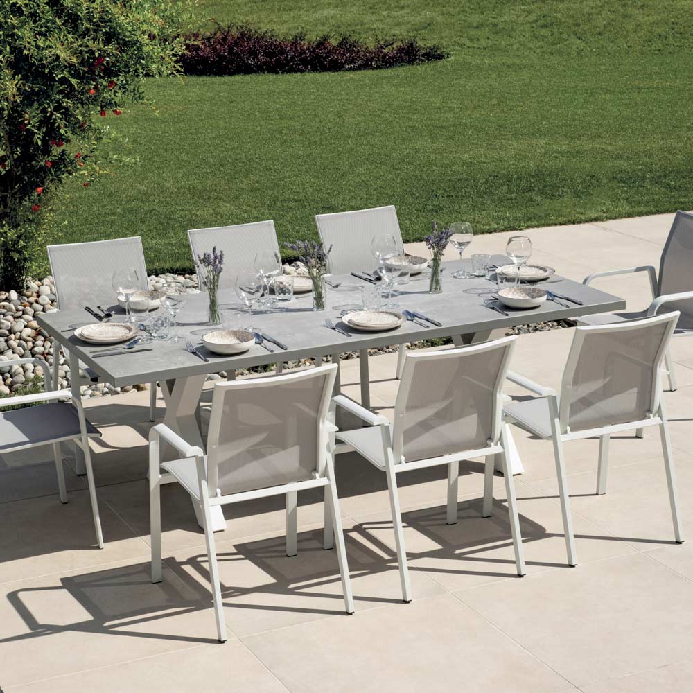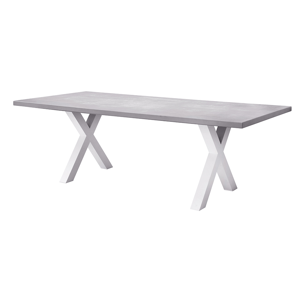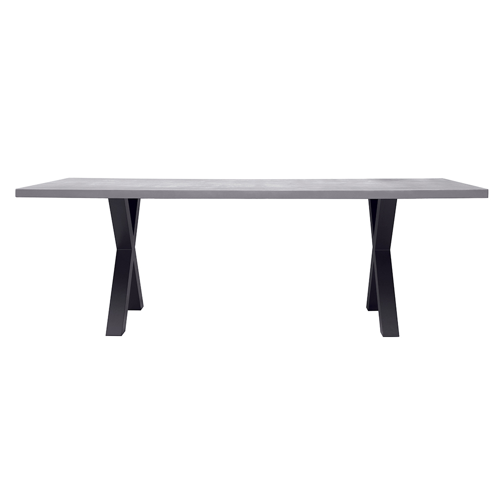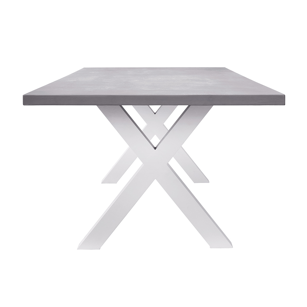 Die graue Harzplatte vereint Eleganz und Funktionalität und bietet eine strapazierfähige, pflegeleichte Oberfläche, die für alle Wetterbedingungen geeignet ist. Die gekreuzten Aluminiumbeine verleihen der Konstruktion ein dynamisches, modernes Aussehen und gewährleisten gleichzeitig Stabilität und Robustheit.