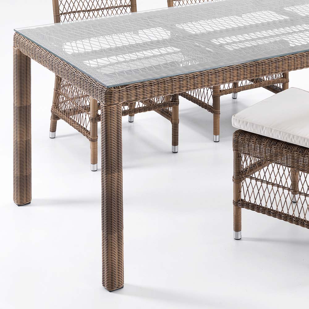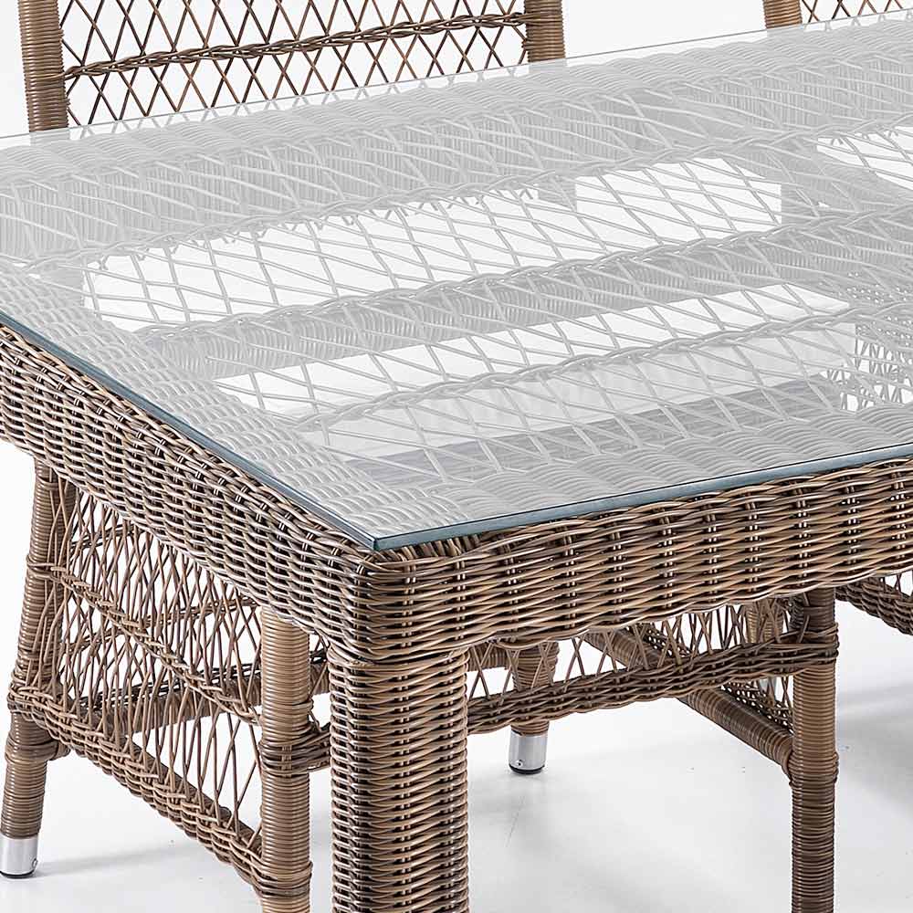 Garten Zusammensetzung bestehend aus: rechteckigen Tisch mit Aluminium Basis und Polyrattan-Geflecht Marke REHAU und Glasplatte, 4 Stühle und 2 Sessel mit Armlehnen mit Aluminiumrahmen und Polyrattan-Geflecht Marke REHAU. Diese Zusammensetzung zeichnet sich durch seine starke klassisches Design, ein Stil aus der Vergangenheit in der Mode in den 60er und 70er Jahren in einem Outdoor-Schlüssel wieder aufgegriffen. Der Geflechtstil ist raffiniert und zart und zusammen mit der sehr hohen Qualität der Materialien und den entschiedenen Formen machen diese Garnitur perfekt für die Einrichtung von Innen- und Außenbereichen, sowohl im privaten als auch im Objektbereich wie Terrassen, Veranden, Gärten, aber sie finden auch einen perfekten Platz am Pool.