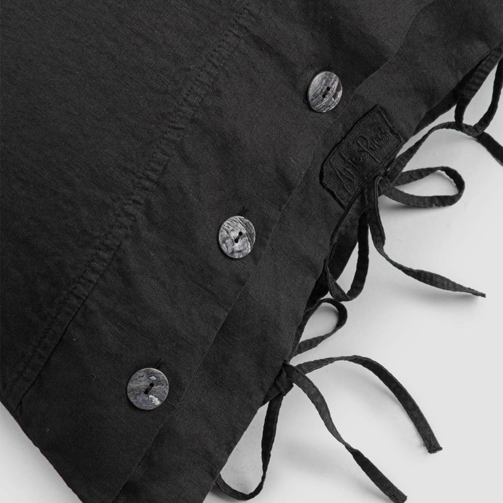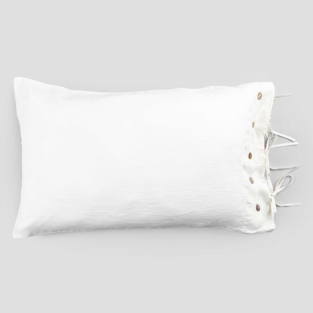 Der Wert der Tradition verbindet den modernen Lebensstil mit diesem weißen oder schwarzen pillowcase leichten Leinen verziert mit einer Reihe von Agoya Perlmutt-Perlmuttknöpfen und Spitze Schließung.