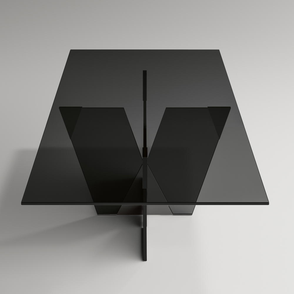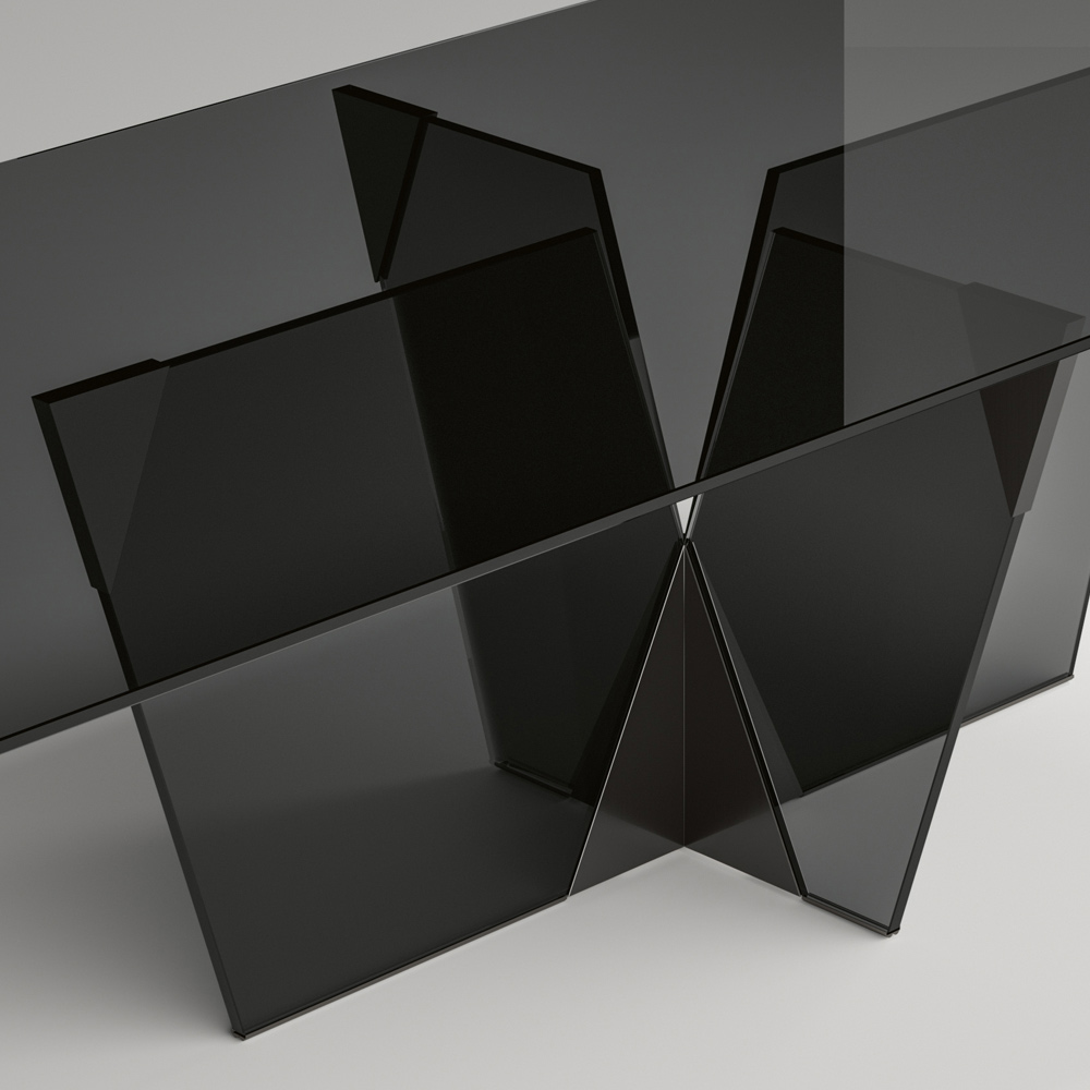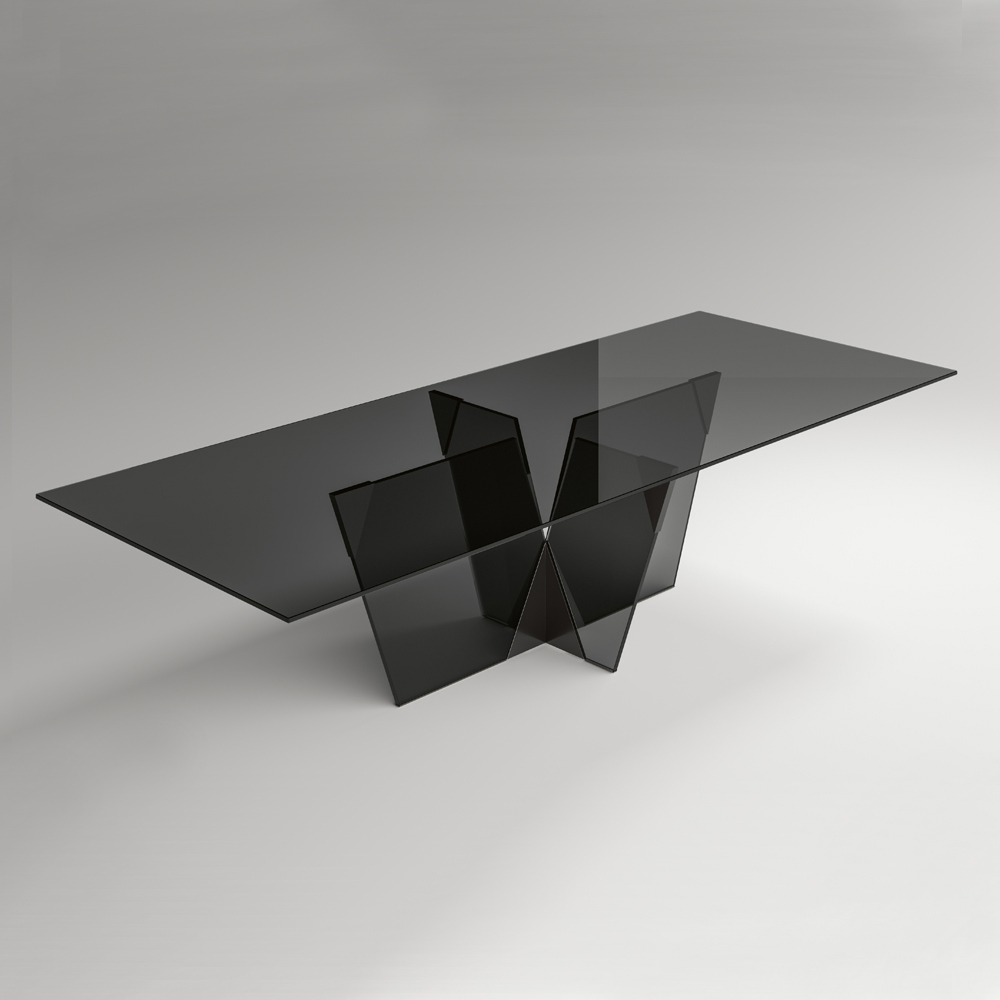 Esstisch mit rechteckiger Tischplatte und Glasfuß komplett in Italien hergestellt . Gekennzeichnet durch eine elegante und skulpturale Struktur , entsteht dieses Möbelstück aus der Kombination von Materialien unterschiedlicher Natur zusammen mit der Leidenschaft für die Glasverarbeitung und schafft es so, durch verschiedene Formen und Dicken eine Darstellung von Stärke und Charakter zu definieren. Die Stärke seiner Ästhetik ist die architektonische Basis, die durch eine pyramidenförmige Verbindung aus Metall gekennzeichnet ist, die den wesentlichen Teil des Produkts darstellt. Die Metallelemente vervollständigen das Design des Tisches, geben dem Glas des Untergestells Form und bereichern es mit Persönlichkeit und Originalität.