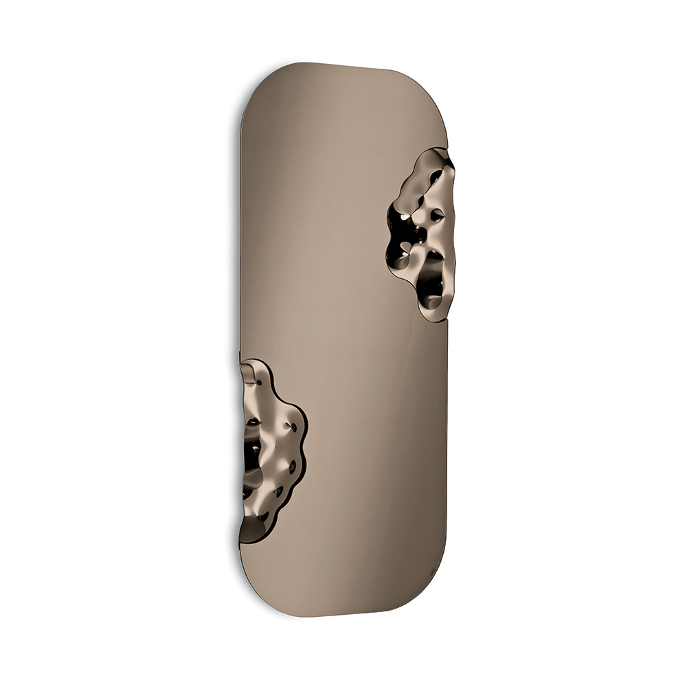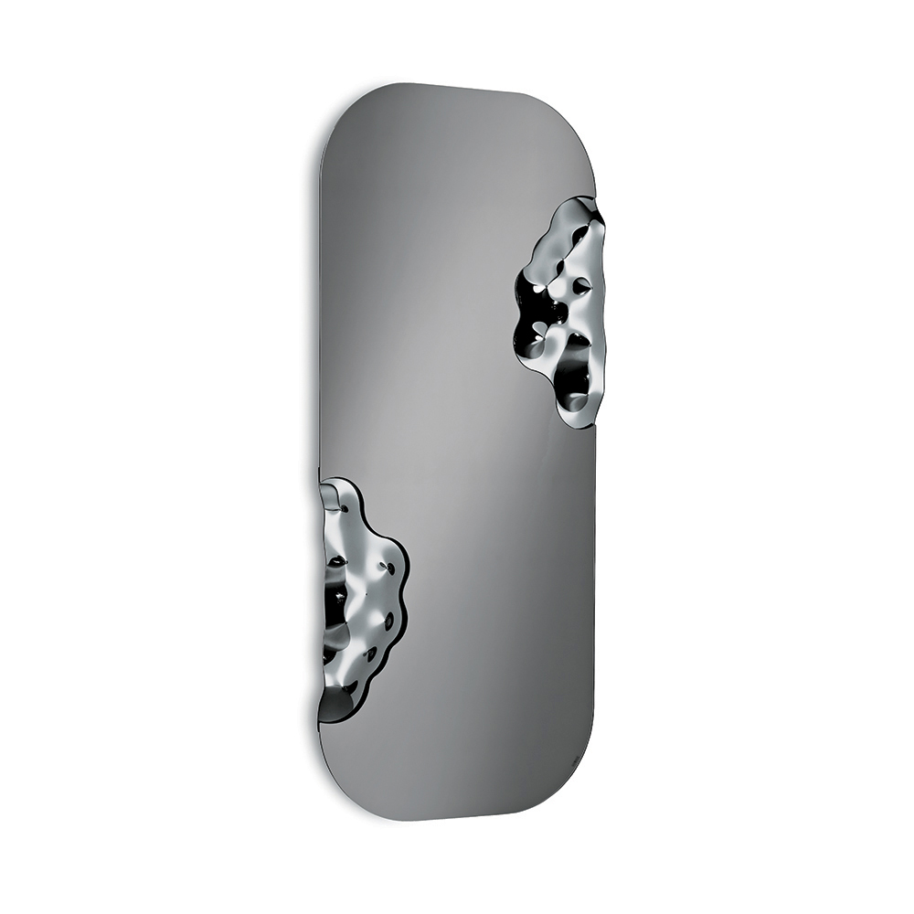 Die rechteckige Fläche mit abgerundeten Ecken verleiht der Komposition Ausgewogenheit und optische Leichtigkeit. Zwei Ton-in-Ton-Elemente aus strukturiertem Glas sind symmetrisch an den vertikalen Seiten des Spiegels angebracht und verleihen dem Design Struktur und Tiefe. So entsteht ein eleganter Kontrast zwischen glatten Oberflächen und aufwendigen Texturen.