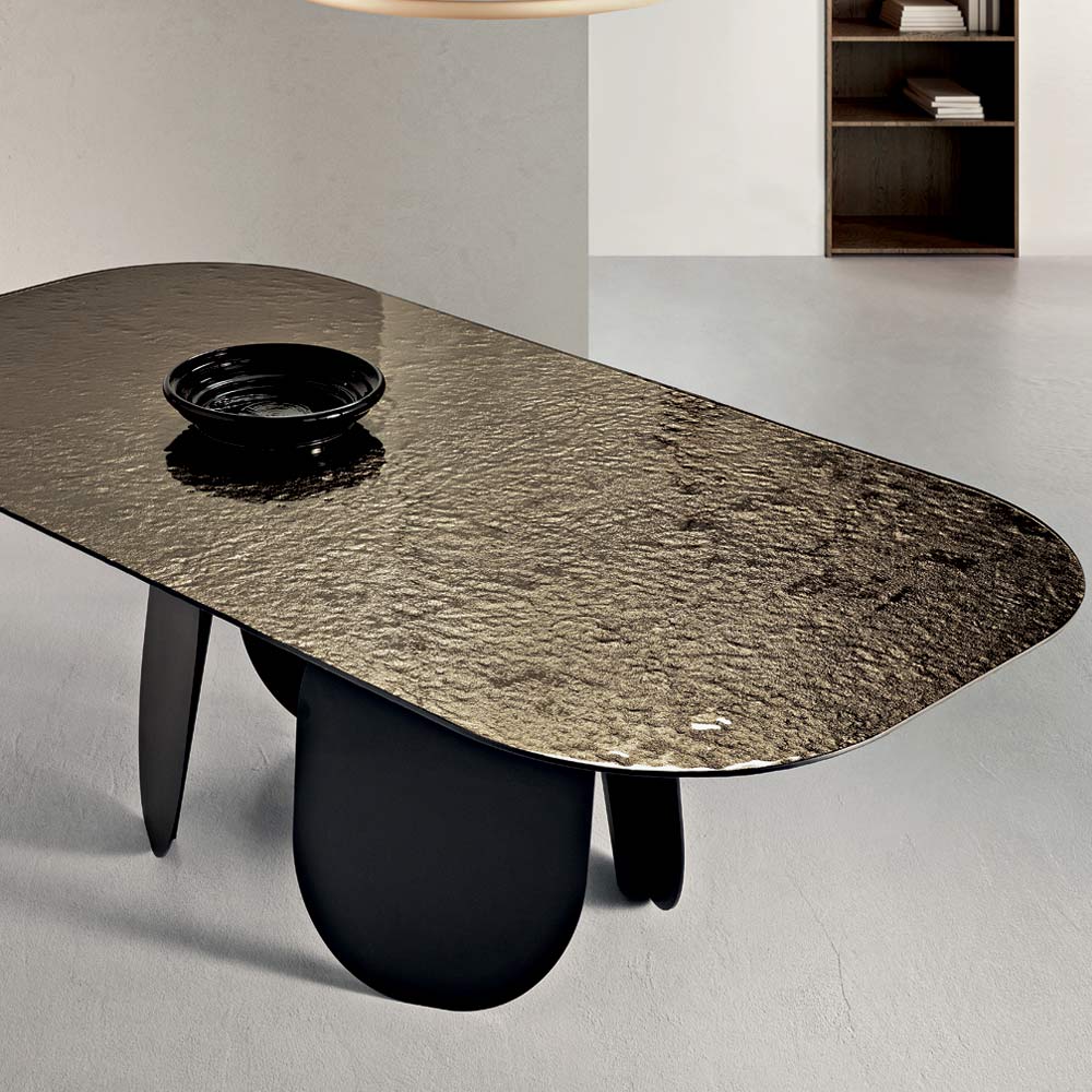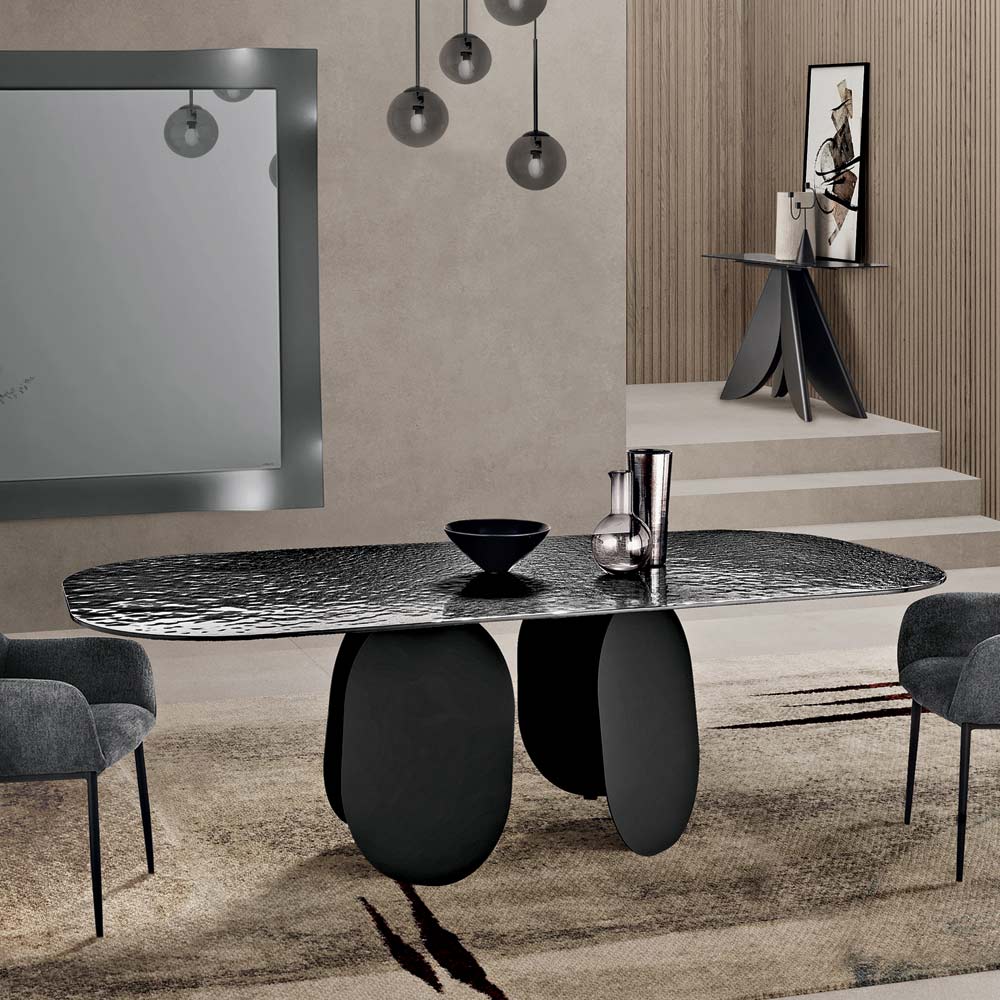 Der Tisch besticht durch sein markantes Gestell aus vier vertikalen, lackierten Metallelementen mit abgerundeter geometrischer Form, die ein dynamisches und modernes Design erzeugen. Diese Konstruktion sorgt für Stabilität und eine starke ästhetische Wirkung.