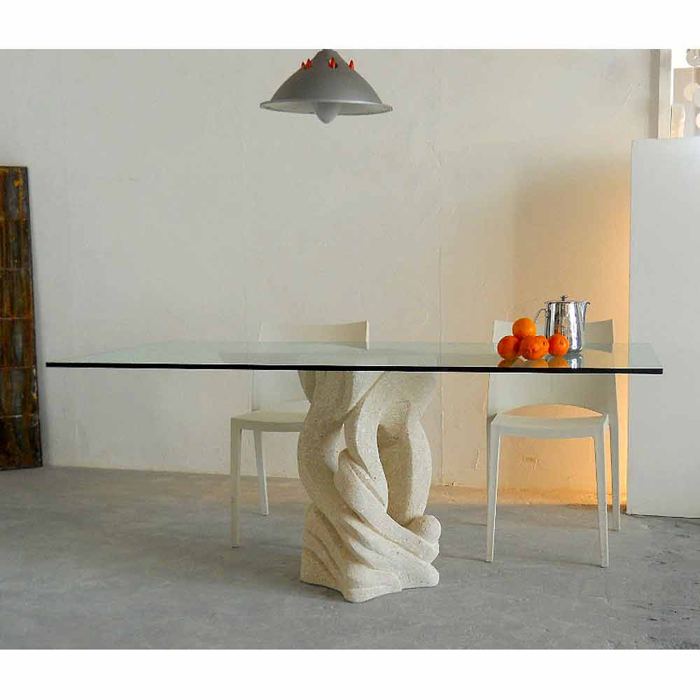 Die Basis ist aus Naturstein aus Vicenza hergestellt und wird von Hand bearbeitet. Die Tischplatte besteht aus Kristall float mit einer Dicke von 15 mm und ist an dem Stein mit einem Flansch befestigt.