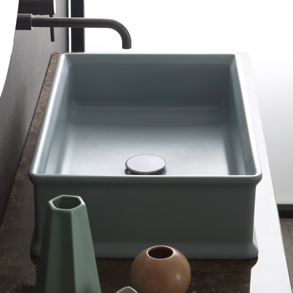 Rechteckiges Aufsatzwaschbecken aus undurchsichtiger farbiger Keramik durch eine 100% Made in Italy Handwerkskunst . Ein Design, das sich durch starke und imposante Linien und Merkmale auszeichnet, macht dieses Möbelstück zu einer perfekten zeitgenössischen Neuinterpretation einer Ästhetik mit Retro-Seele dank der Verwendung von Farben, die ein exklusives und raffiniertes Ergebnis zum Leben erwecken.