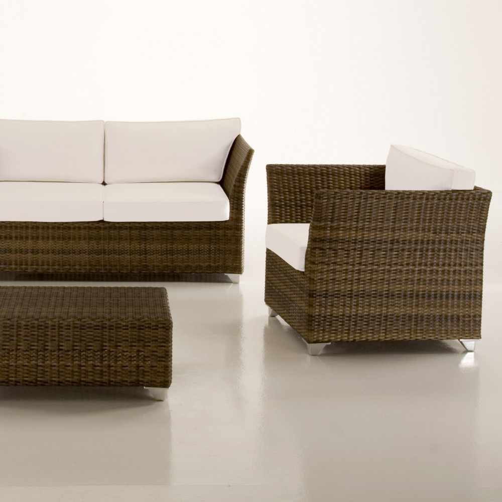 Outdoor-Lounge-Set bestehend aus 2 Sesseln und 1 2-Sitzer-Sofa mit Aluminiumrahmen , Polyrattan-Geflecht der Marke REHAU und Sitz- und Rückenkissen aus weißem Outdoorstoff .