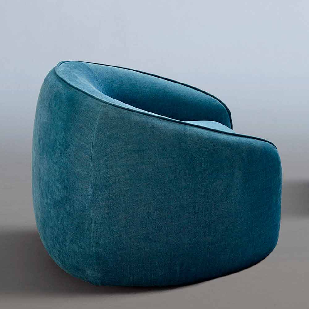 Moderner Entspannungssessel in Orange oder Luftwaffenblau, luxuriöses Design mit runden Formen, hergestellt in Italien.