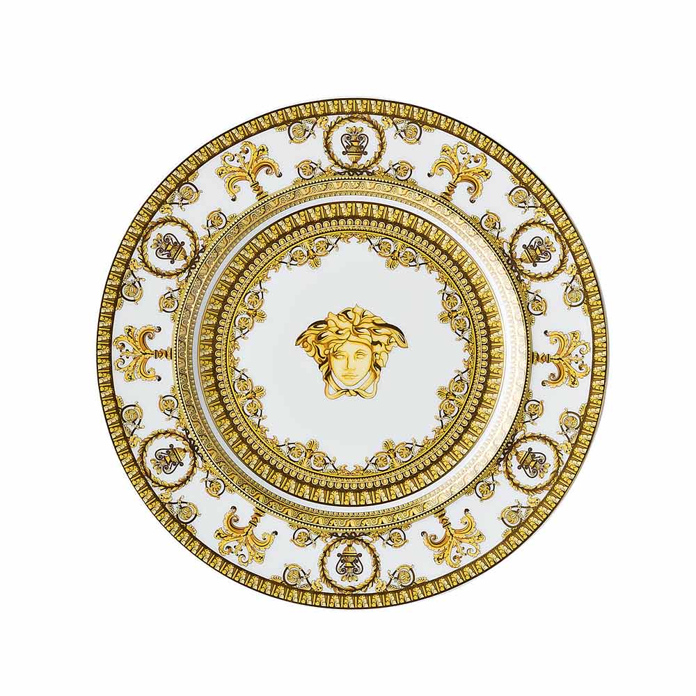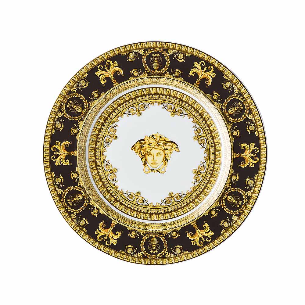 Der Versace I Love Baroque Brotteller aus feinem Porzellan ist eine Ode an die zeitlose Eleganz und Opulenz, die für das Haus typisch ist. Das aufwendige Design zeigt goldene Barockmotive, die sich elegant auf schwarzem oder weißem Hintergrund verflechten und einen Kontrast erzeugen, der das ikonische Medusa -Gesicht in der Mitte hervorhebt. Jedes Detail ist eine Hommage an den Luxus und die Handwerkskunst von Versace .