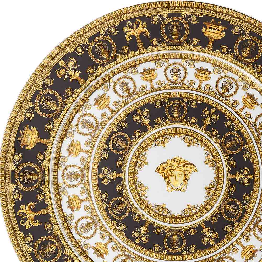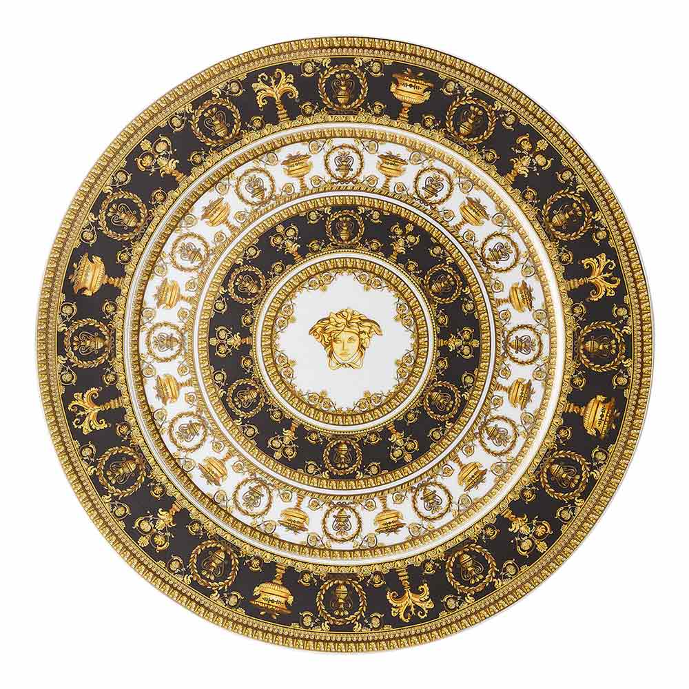 Das Tischset I Love Baroque von Versace aus kostbarem Porzellan ist ein wahres Meisterwerk zeitloser Eleganz und Raffinesse . Sein aufwendiges Design zeichnet sich durch reiche goldene Barockdetails aus, die sich harmonisch auf einem schwarz-weißen Hintergrund verflechten und einen visuellen Effekt exklusiven Luxus erzeugen. Das ikonische Gesicht der Medusa , das unverwechselbare Symbol des Hauses, sticht in der Mitte hervor, umrahmt von ornamentalen Motiven, die seine Erhabenheit unterstreichen.
