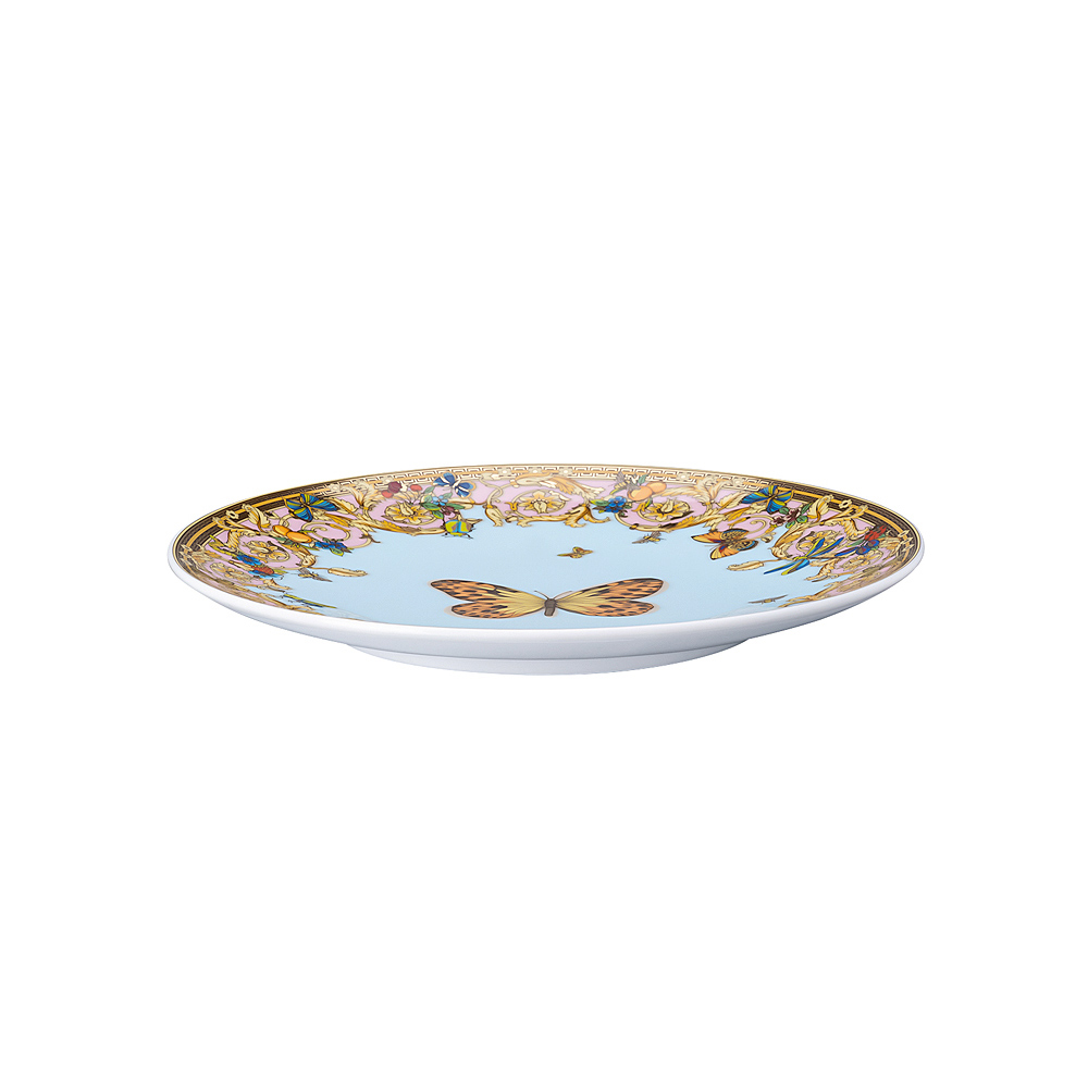 Dieser bezaubernde Porzellanteller besticht durch sein helles und farbenfrohes Design, das sofort ins Auge fällt und ihn zu einem Sammlerstück und einem edlen Tischgeschirr macht. In der Mitte sticht ein eleganter Schmetterling hervor, umgeben von einem zarten Zierrand mit Blumen- und Arabeskenmotiven auf einem ruhigen blauen Hintergrund.