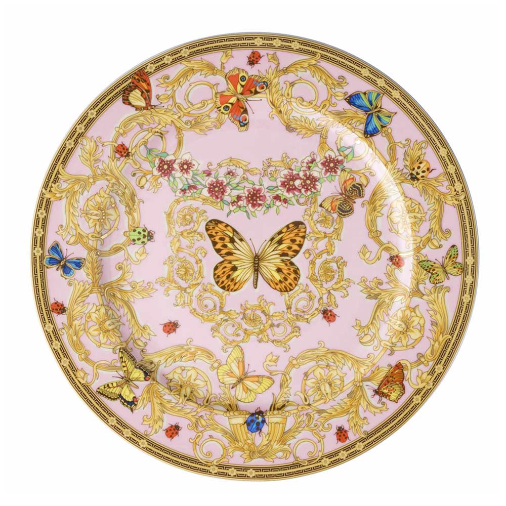 Dieser prächtige Porzellanteller zelebriert die Schönheit der Natur mit seinem üppigen Design aus bunten Schmetterlingen und komplizierten Blumenmotiven vor einem herrlichen rosa Hintergrund. Jedes Detail ist sorgfältig ausgearbeitet, von den lebhaften Schmetterlingen, die vom Teller zu fliegen scheinen, bis zu den zarten Blumen und Goldornamenten, die das Design einrahmen und verschönern.
