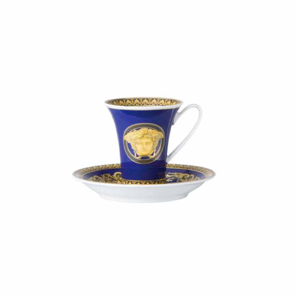 Die äußerst stilvolle Kaffeetasse und Untertasse von Versace ist Teil der elegant-modernen Kollektion, die, kombiniert mit einem faszinierenden und raffinierten Glamour, an vergangene Epochen erinnert und in dem leuchtenden Blauton zum Ausdruck kommt und den Namen Medusa Blue trägt.