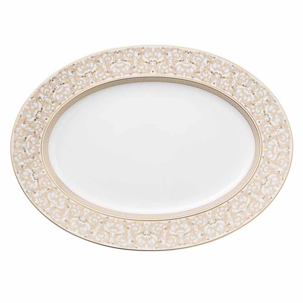 Rosenthal Versace Medusa Gala Teller oval 40cm Design Porzellan Der 40,5 x 30 cm große ovale Teller von Versace ist Teil der raffinierten und luxuriösen Tischkollektion Medusa Gala. Inspiriert von der Opulenz und der einzigartigen Atmosphäre von Galadinners interpretiert Medusa Gala die traditionellen Versace-Motive in Design und Dekoration neu: Die ikonische Darstellung der Medusa wechselt mit raffinierten barocken Ornamenten in kostbarem Goldfiligran. Ein aufregender Kontrasteffekt zwischen dem Weiß des Porzellans und dem reinen Gold erweckt eine perfekte Inszenierung zum Leben, modern und zugleich einzigartig. Medusa Gala ist mit Motiven und Dekorationen ganz in Gold bereichert und ist in einer noch luxuriöseren „Gold“-Version erhältlich, die sich perfekt zur Integration und weiteren Verschönerung des Tisches eignet.