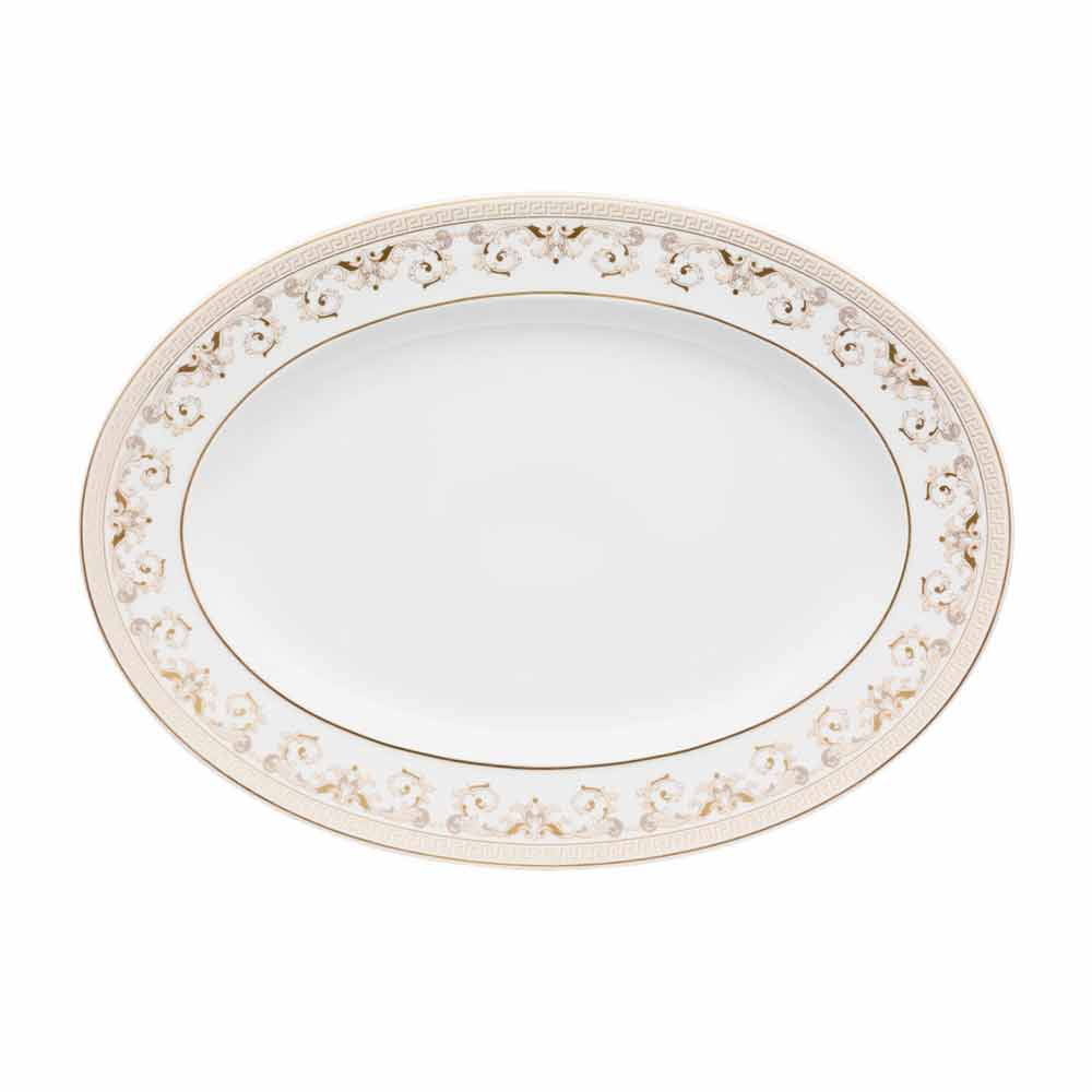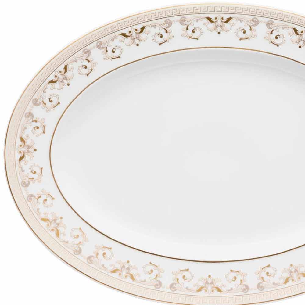 Rosenthal Versace Medusa Gala Teller oval 34cm Design Porzellan Der 34x24,5 cm große ovale Teller von Versace ist Teil der raffinierten und luxuriösen Medusa Gala-Tischkollektion. Inspiriert von der Opulenz und der einzigartigen Atmosphäre von Galadinners interpretiert Medusa Gala die traditionellen Versace-Motive in Design und Dekoration neu: Die ikonische Darstellung der Medusa wechselt mit raffinierten barocken Ornamenten in kostbarem Goldfiligran. Ein aufregender Kontrasteffekt zwischen dem Weiß des Porzellans und dem reinen Gold erweckt eine perfekte Inszenierung zum Leben, modern und zugleich einzigartig. Medusa Gala ist mit Motiven und Dekorationen ganz in Gold bereichert und ist in einer noch luxuriöseren „Gold“-Version erhältlich, die sich perfekt zur Integration und weiteren Verschönerung des Tisches eignet.