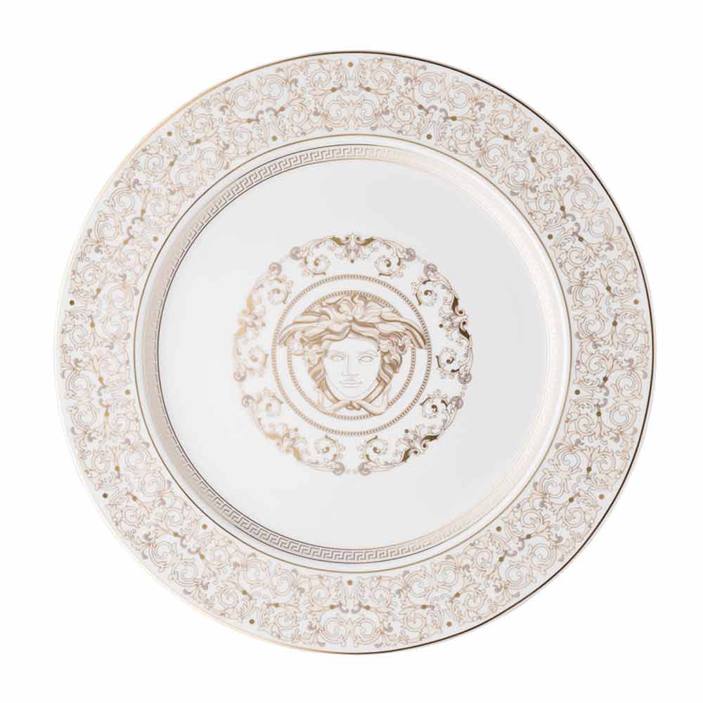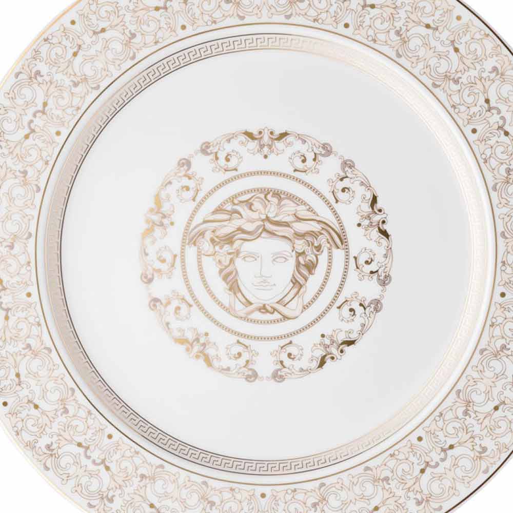 Rosenthal Versace Medusa Gala Design Tischkartenteller aus Porzellan Der fabelhafte 30 cm große Tischkartenteller von Versace ist Teil der raffinierten und luxuriösen Medusa Gala-Tischkollektion. Inspiriert von der Opulenz und der einzigartigen Atmosphäre von Galadinners interpretiert Medusa Gala die traditionellen Versace-Motive in Design und Dekoration neu: Die ikonische Darstellung der Medusa wechselt mit raffinierten barocken Ornamenten in kostbarem Goldfiligran. Ein aufregender Kontrasteffekt zwischen dem Weiß des Porzellans und dem reinen Gold erweckt eine perfekte Inszenierung zum Leben, modern und zugleich einzigartig. Medusa Gala ist mit Motiven und Dekorationen ganz in Gold bereichert und ist in einer noch luxuriöseren „Gold“-Version erhältlich, die sich perfekt zur Integration und weiteren Verschönerung des Tisches eignet.