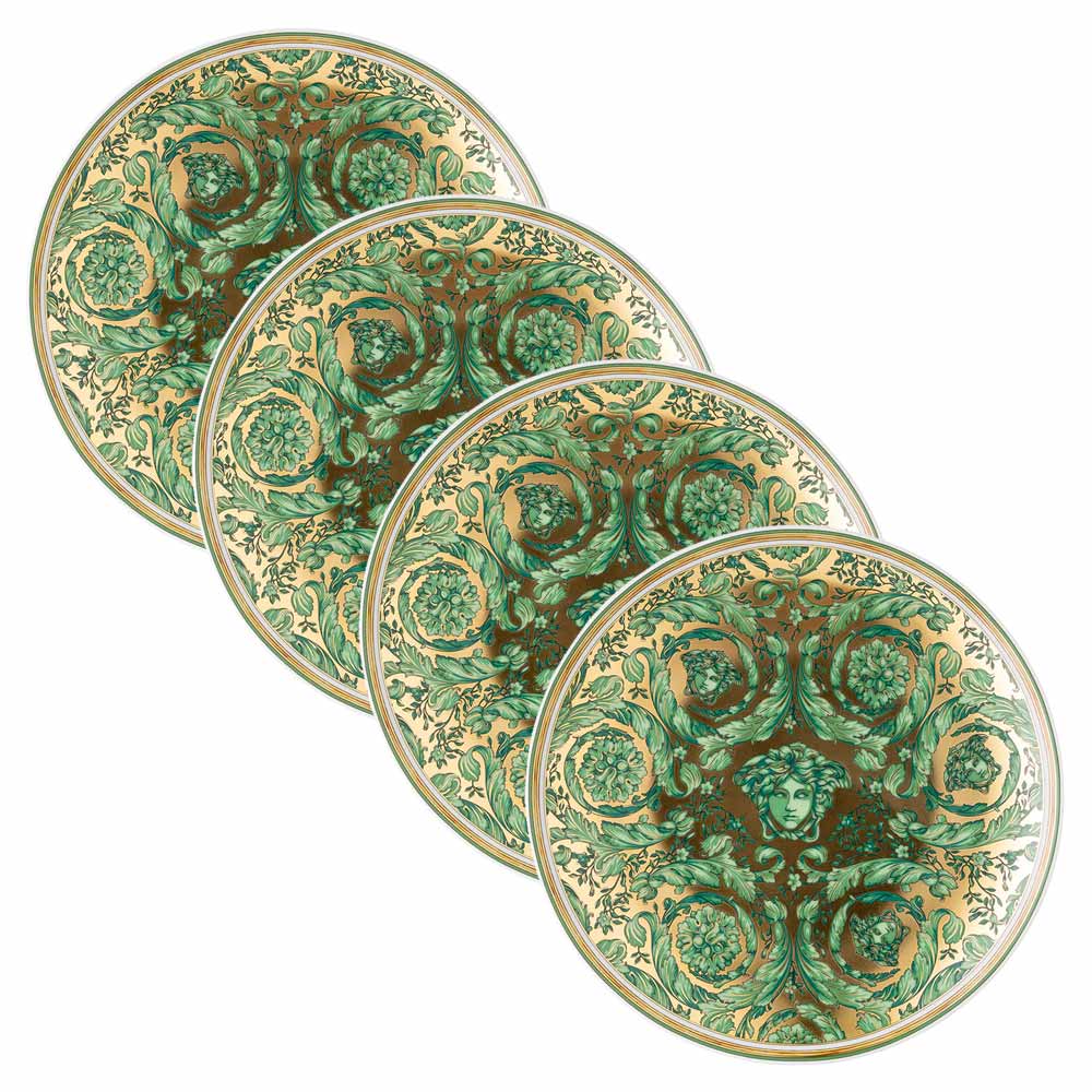 Die smaragdgrünen Töne und die eingewebten barocken Motive schaffen eine prächtige und einladende Atmosphäre und verwandeln Ihren Tisch in eine Traumkulisse. Perfekt, um Ihren Weihnachtsessen einen Hauch von Glamour und Raffinesse zu verleihen. Es ist ein Objekt, das Tradition und Moderne mit dem einzigartigen Stil von Versace verbindet.