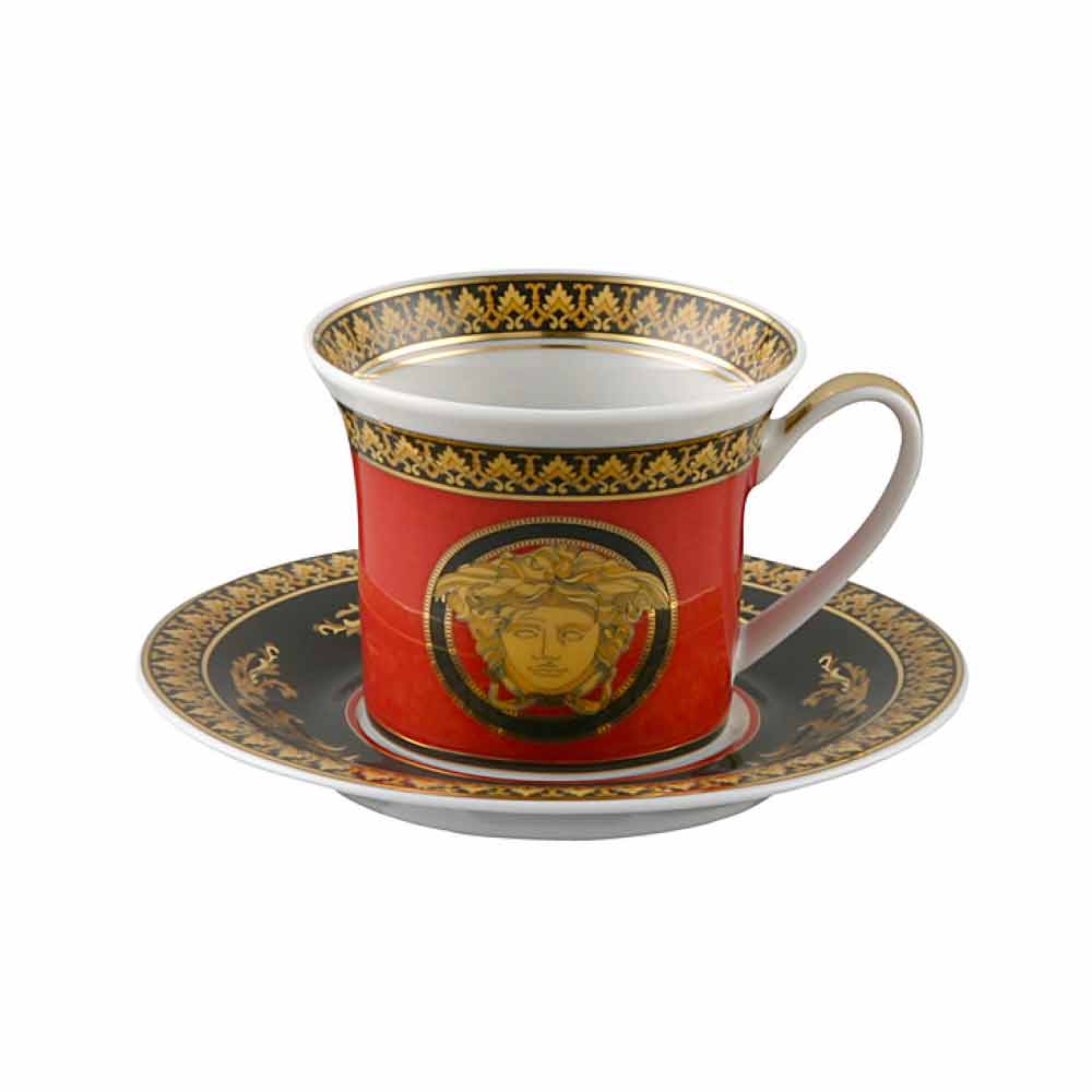 Rosenthal Versace Medusa Rosso Espressotasse Design aus Porzellan Die Espressotasse inklusive Untertasse mit einzigartigem und unverwechselbarem Design von Versace ist Teil der Linie Medusa Rosso, die aus zwei bzw. drei Farbtönen besteht: einem eleganten Rot und dem sehr kostbaren Gold und Schwarz; in ihrer Kombination ergeben diese ein raffiniertes Motiv, das Sie in faszinierende und ferne Epochen entführt. Der Kopf der Medusa ist das Wahrzeichen der Versace-Kollektion und macht dieses Service zu einem Klassiker, zugleich aber zu einem Symbol für Luxus auf der modernen Tafel. Achtung: Nicht in der Spülmaschine reinigen, bitte per Hand spülen!