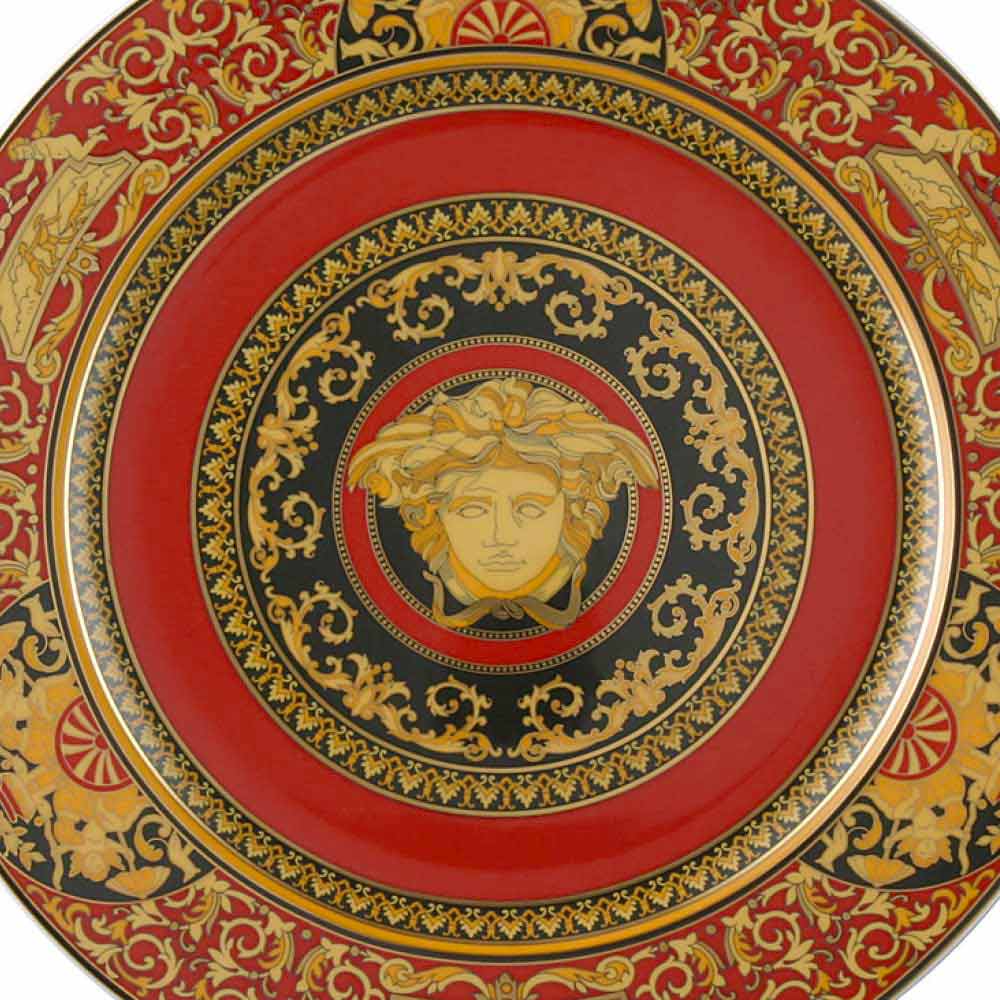 Rosenthal Versace Medusa Rosso Platzhalterteller 30cm aus Porzellan Der fantastische Tisch- oder Wandteller von Versace ist Teil der Linie Medusa Rosso , die aus zwei bzw. drei Farbtönen besteht: einem eleganten Rot und dem sehr kostbaren Gold und Schwarz; in Kombination ergeben diese ein raffiniertes Motiv, das Sie in faszinierende und ferne Epochen entführt. Der Kopf der Medusa ist das Wahrzeichen der Versace-Kollektion und macht dieses Service zu einem Klassiker, zugleich aber zu einem Symbol für Luxus auf der modernen Tafel. Achtung: Nicht in der Spülmaschine reinigen, bitte per Hand spülen!