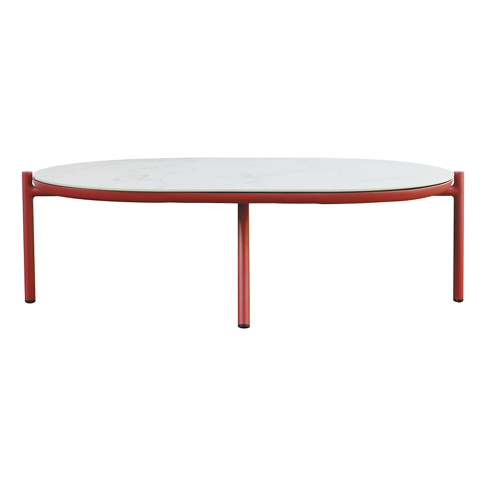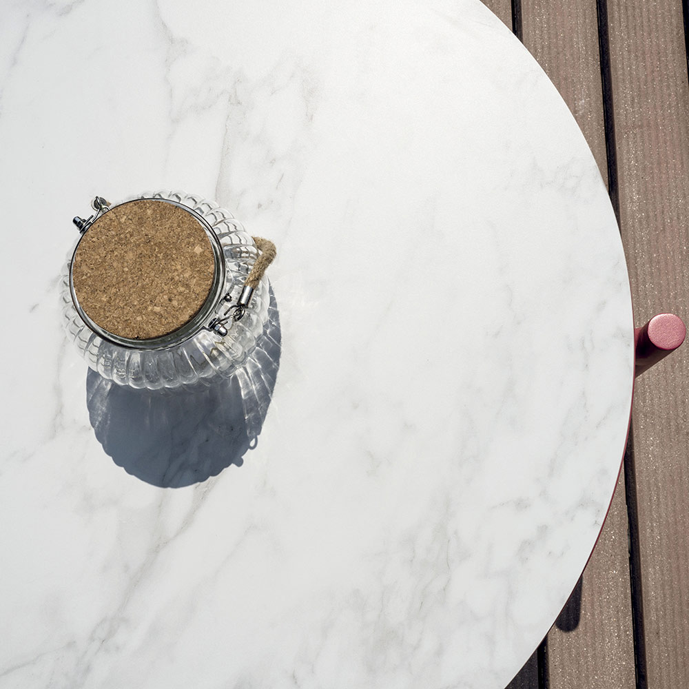 1 Couchtisch: Sockel aus weißem Aluminium und Platte aus Steingut mit Steineffekt.