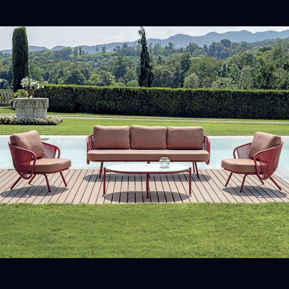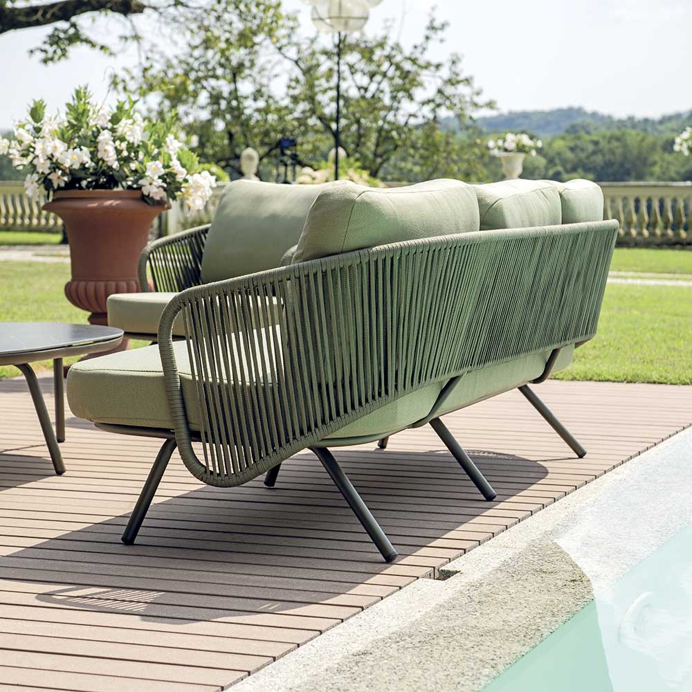 1 Sofa: Struktur aus Aluminium, Rückenlehne aus Seil, Kissen aus abnehmbarem Stoff.