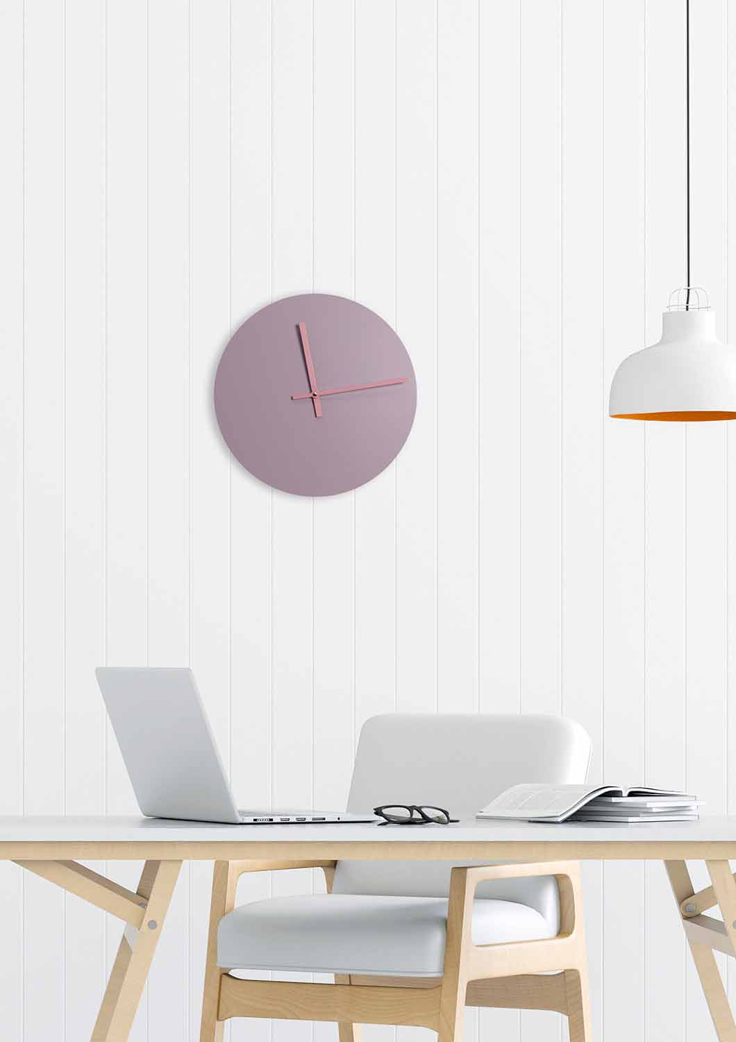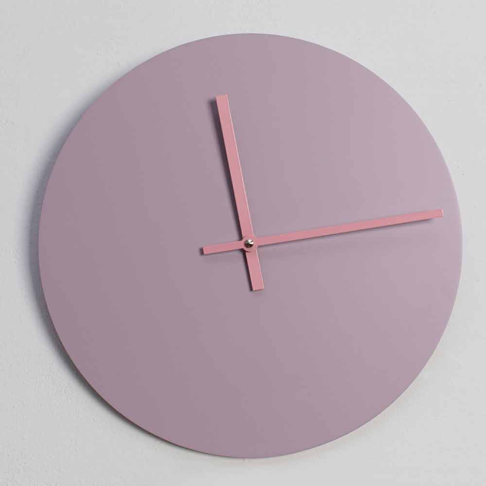 Runde Wanduhr in rosa Farbe, modernes Design in Holz, hergestellt in Italien.