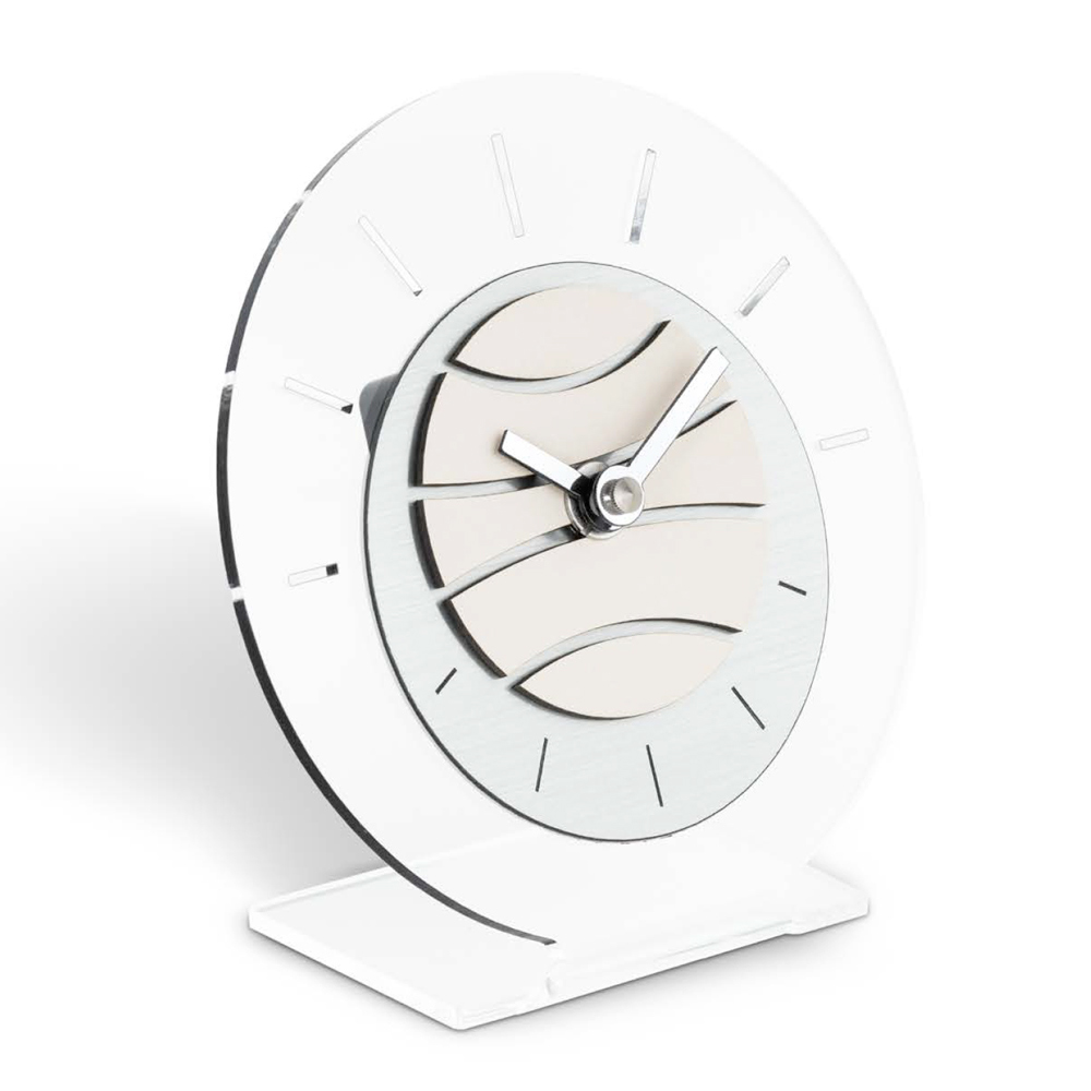 Tischuhr aus hochdichtem und reinem transparentem Methacrylat , Zuschnitt des Sockels und des Zifferblatts mit High-Tech-Werkzeugen, vollständig in Italien hergestellt.