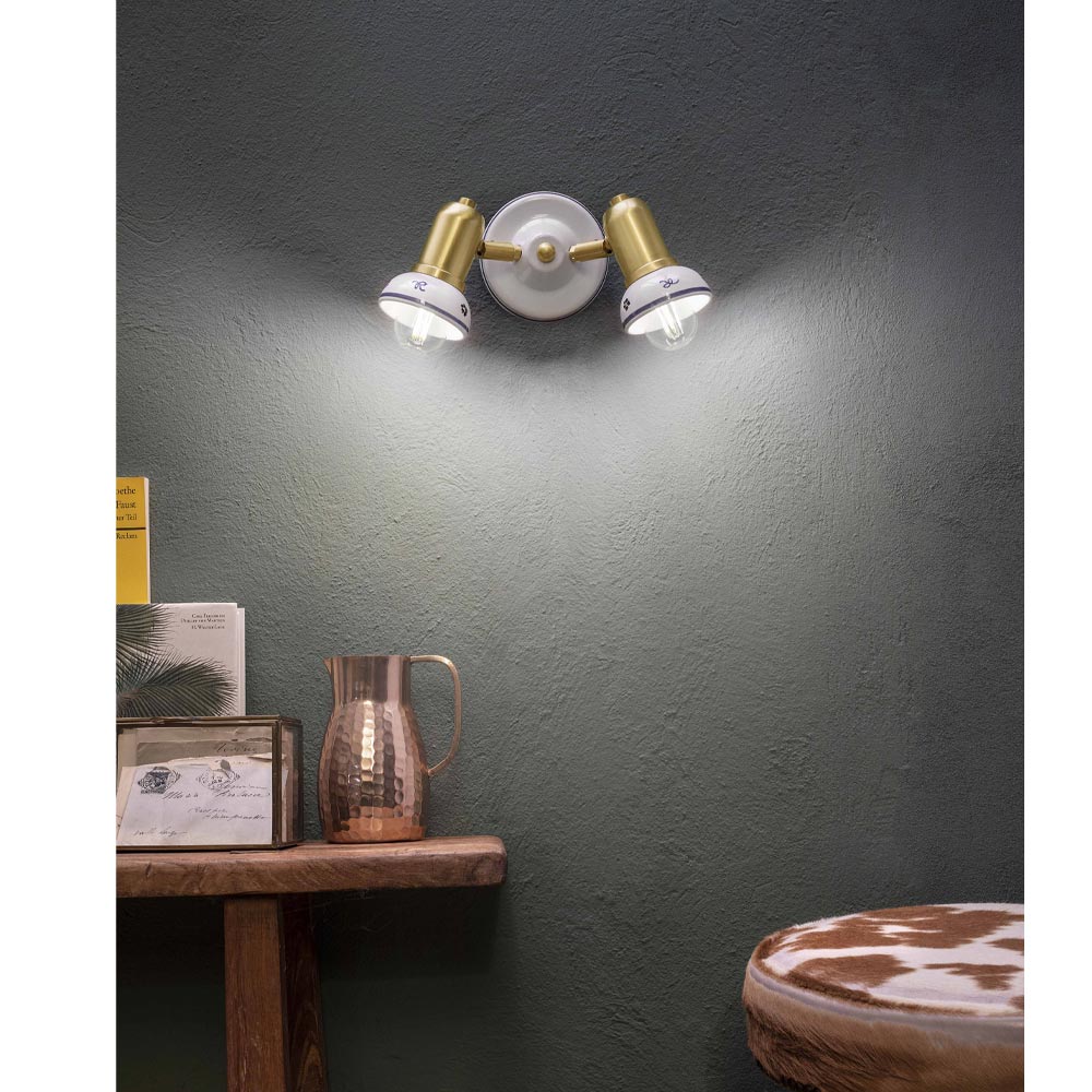Runde Wandleuchte mit 2 Leuchten aus Messing und handbemalter Keramik, hergestellt in Italien von Ferroluce.