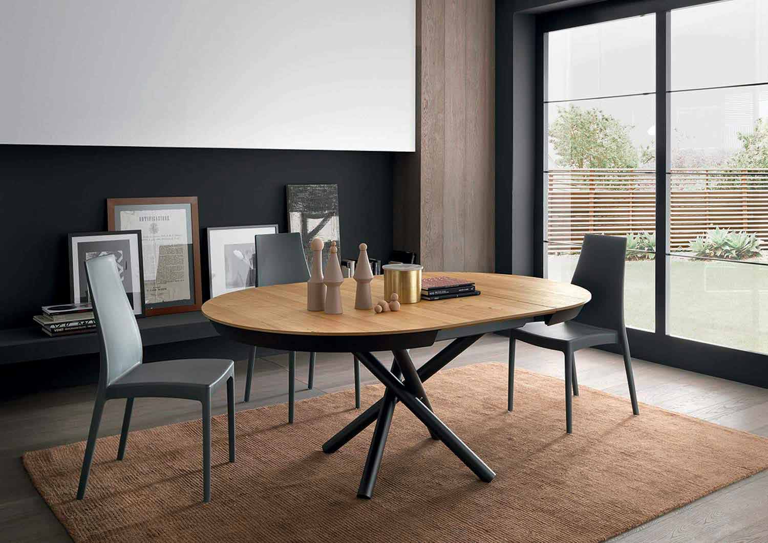 Die einzigartige Verflechtung von Metallbeinen unterstützt gekonnt die Holzplatte, die sich dank eines Teleskopmechanismus ausdehnen kann, um mehr Gäste aufzunehmen.