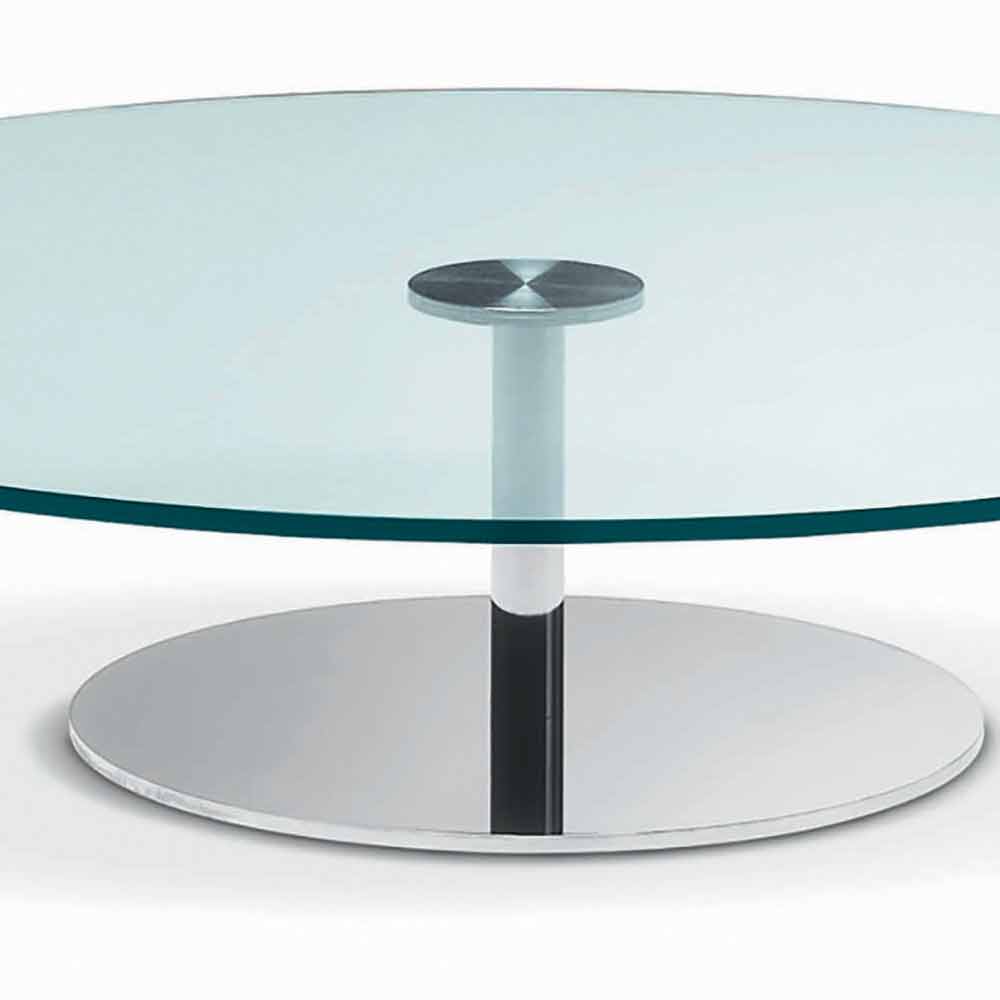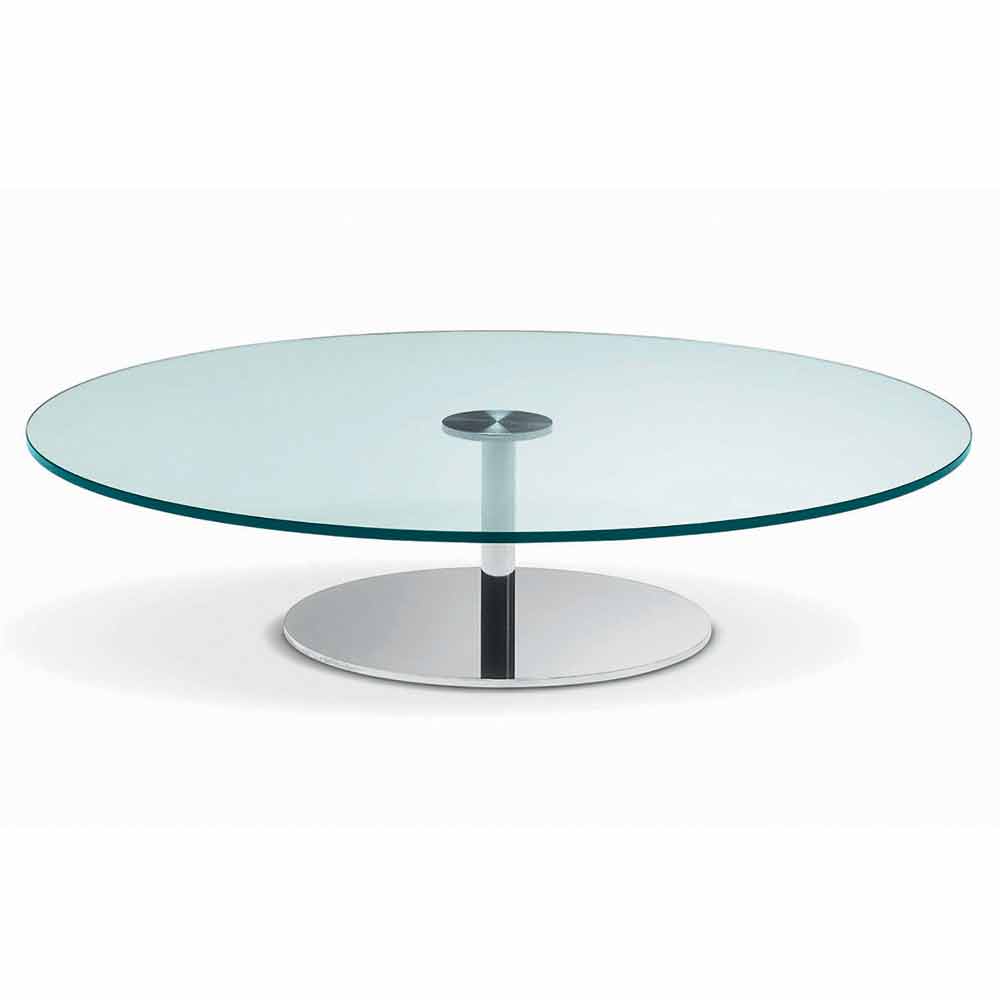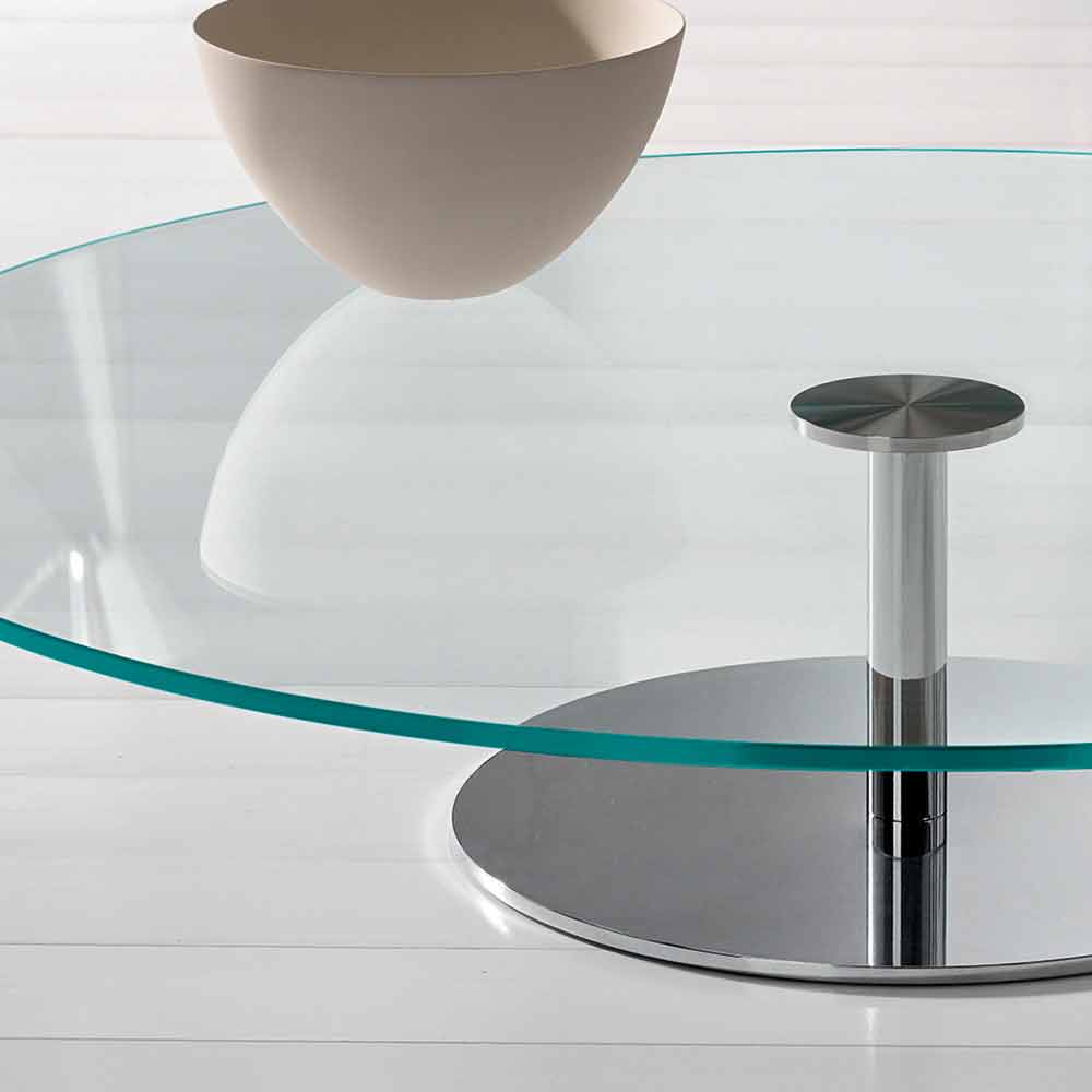 Dieser niedrige Couchtisch für das Wohnzimmer mit rundem Design zeichnet sich durch die komplett aus extraklarem Glas gefertigte Platte und einem Metall-Untergestell in Chrom-Optik aus, das wunderbare Licht- und dreidimensionale Effekte erzeugt.