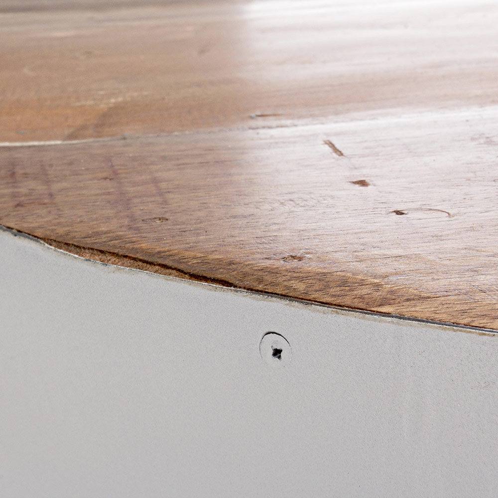 Dieser Couchtisch imrunden Design besteht aus einem original recycelten Stahlgestell und einer recycelten Holzplatte mit einer Oberfläche auf Nitrozellulosebasis. In der Produktion umfasst recyceltes Holz Holzabfälle, um die ursprünglich im Produkt vorhandenen Löcher zu verschließen.