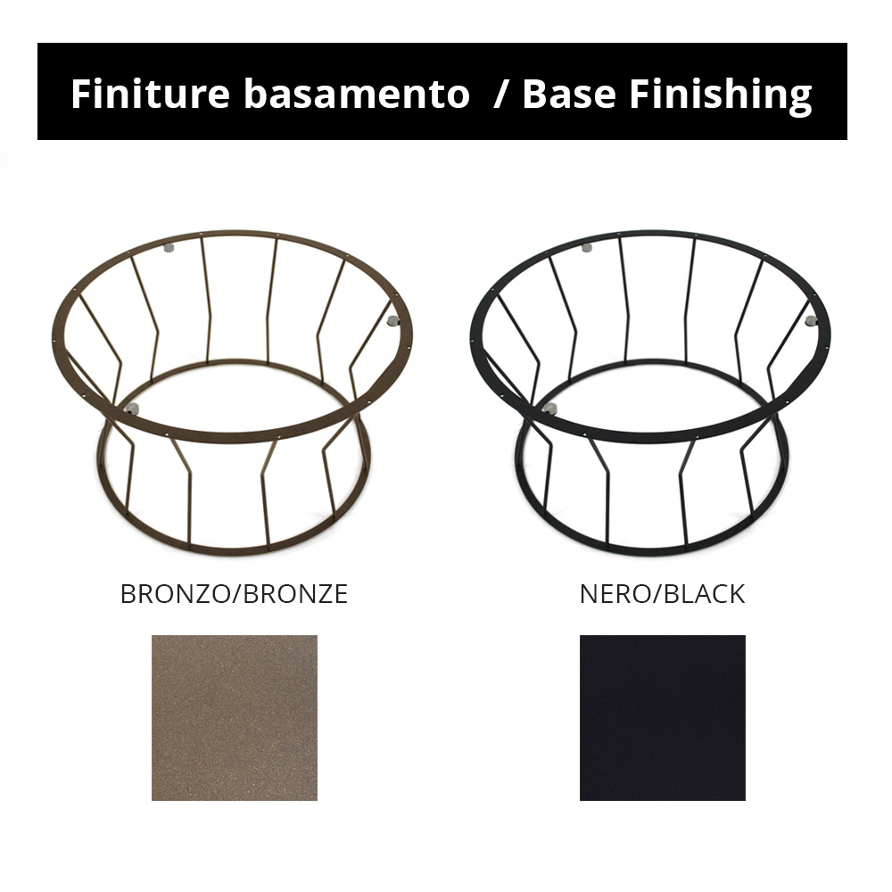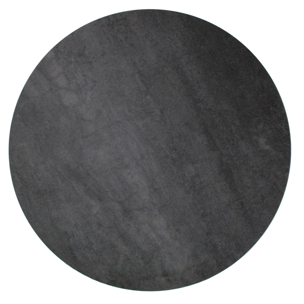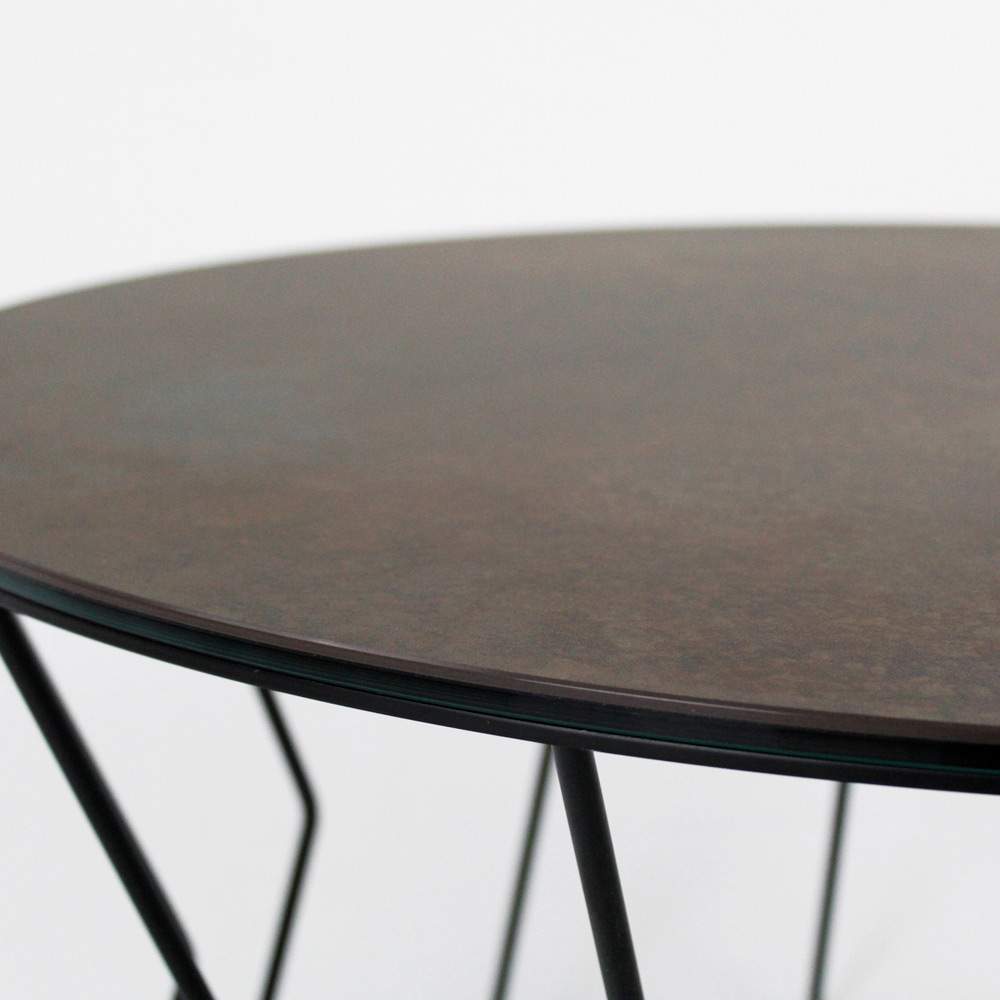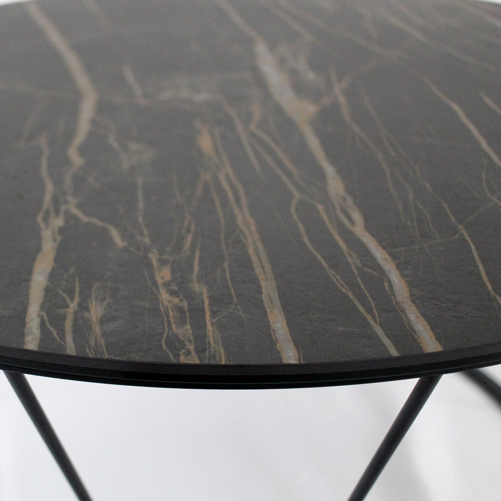 Runder Couchtisch mit lackiertem Stahlsockel und Platte aus Feinsteinzeug.