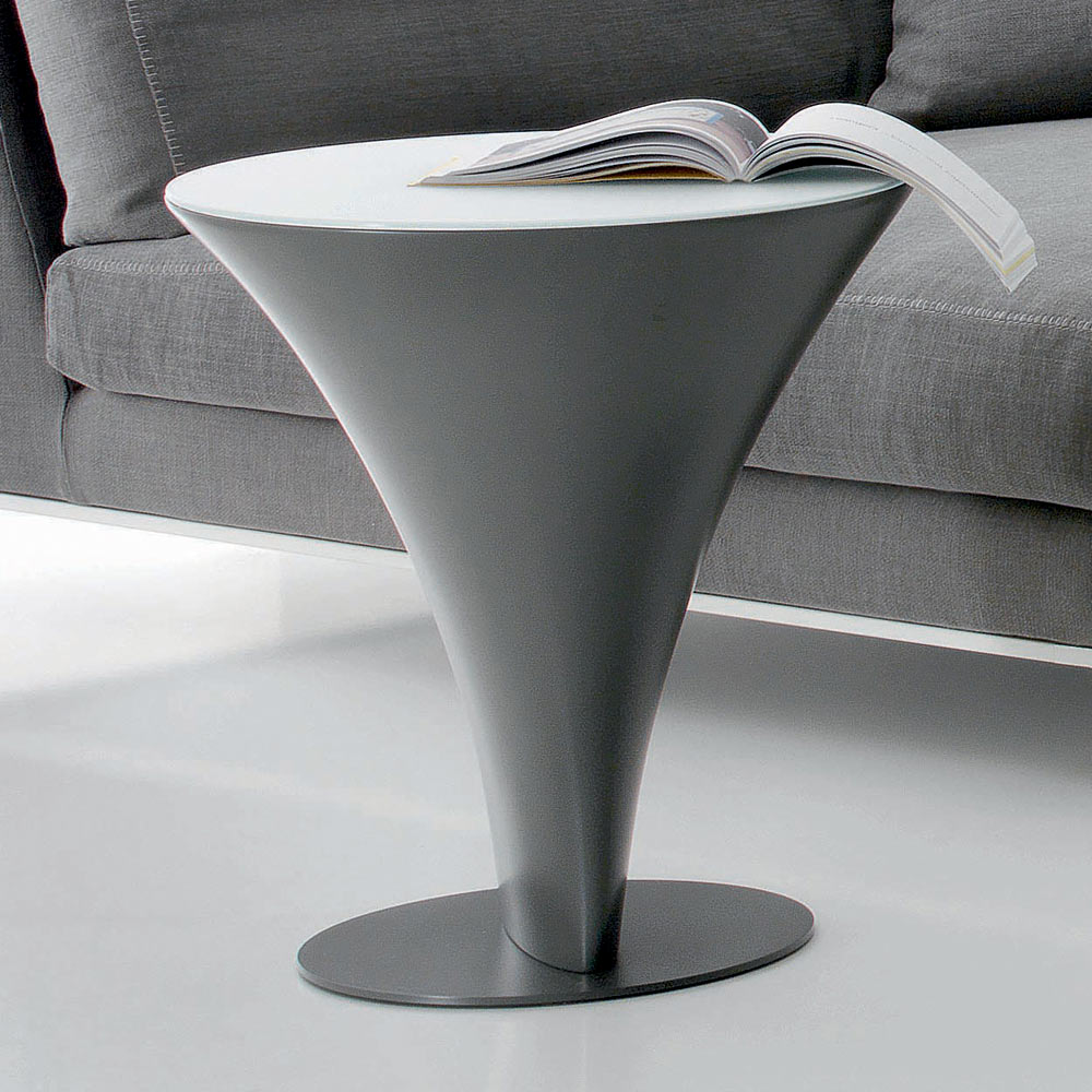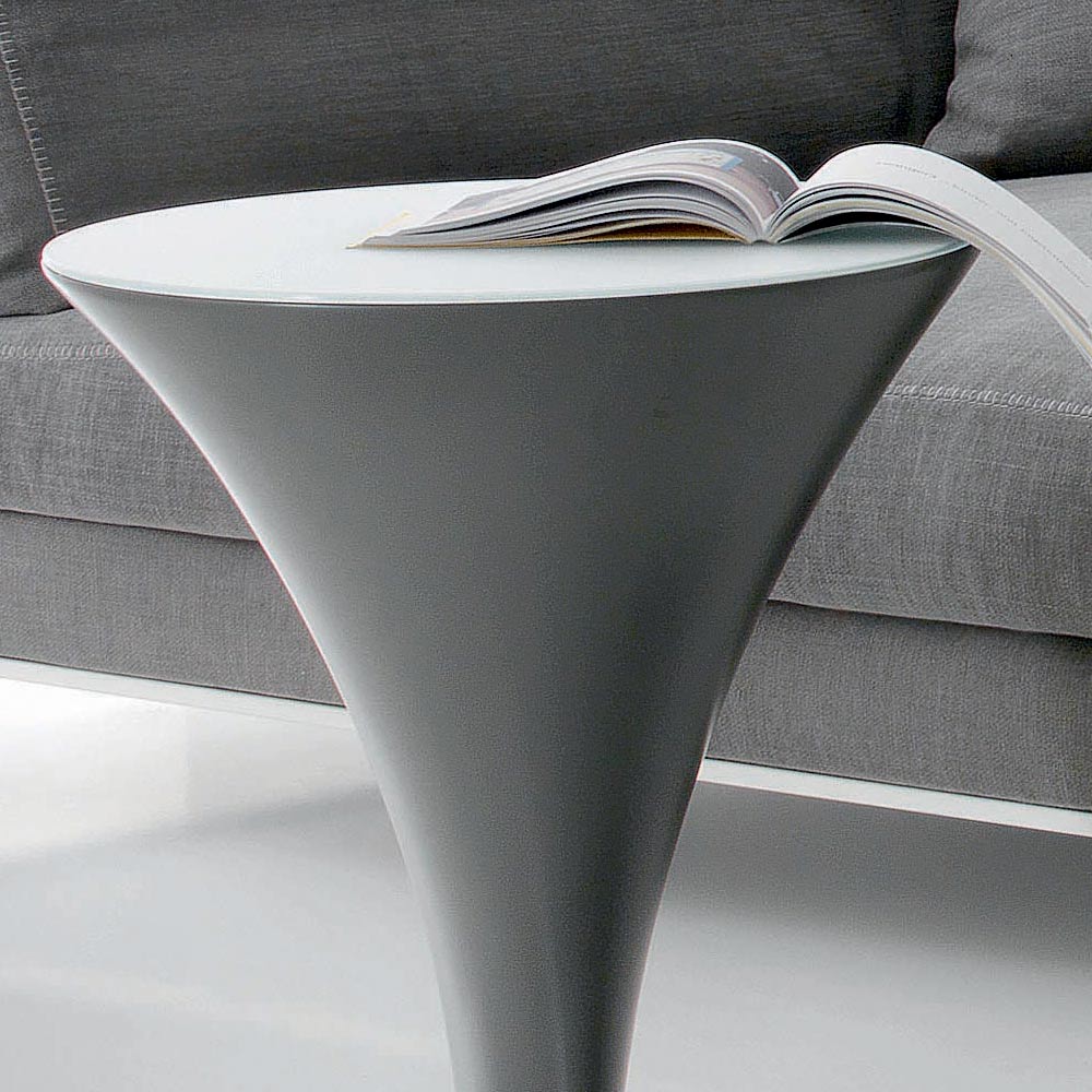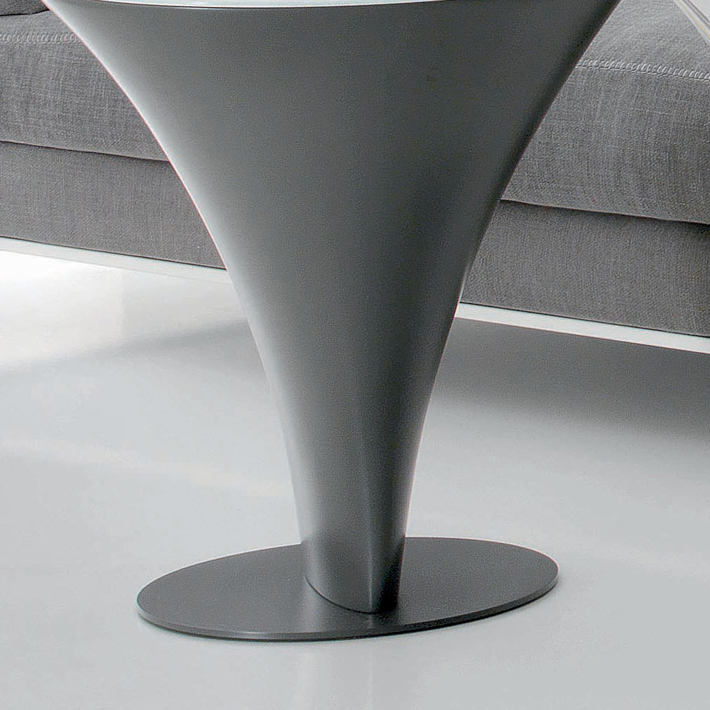 Dieser runde Couchtisch hat eine Struktur aus Polyurethan und lackiertem Metallgestell mit Milchglas. Die Besonderheit der Ergänzung besteht in der soliden Basis, die sich bis zum Boden verengt und sich an einem Ballast verankert, der ihr Stabilität verleiht und ihr eine originelle Bootsform verleiht, die durch die Brillanz der Glasplatte verstärkt wird.