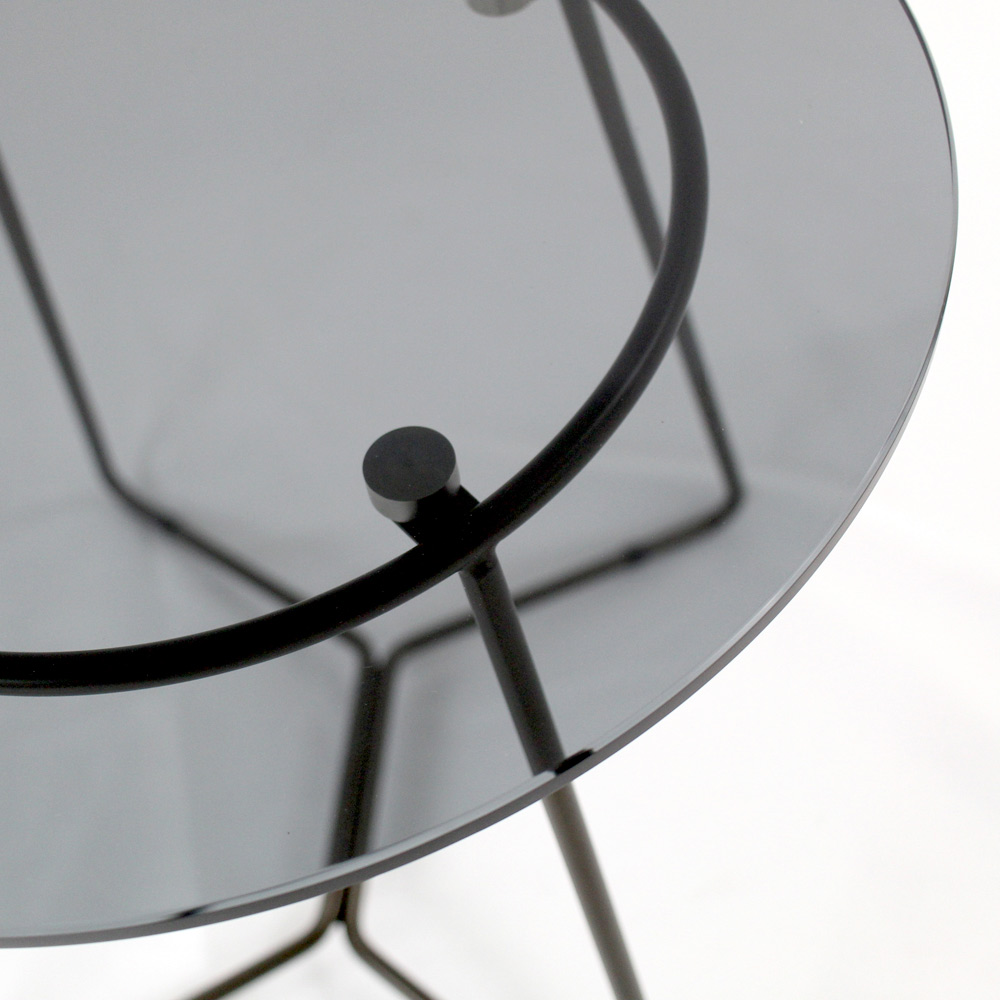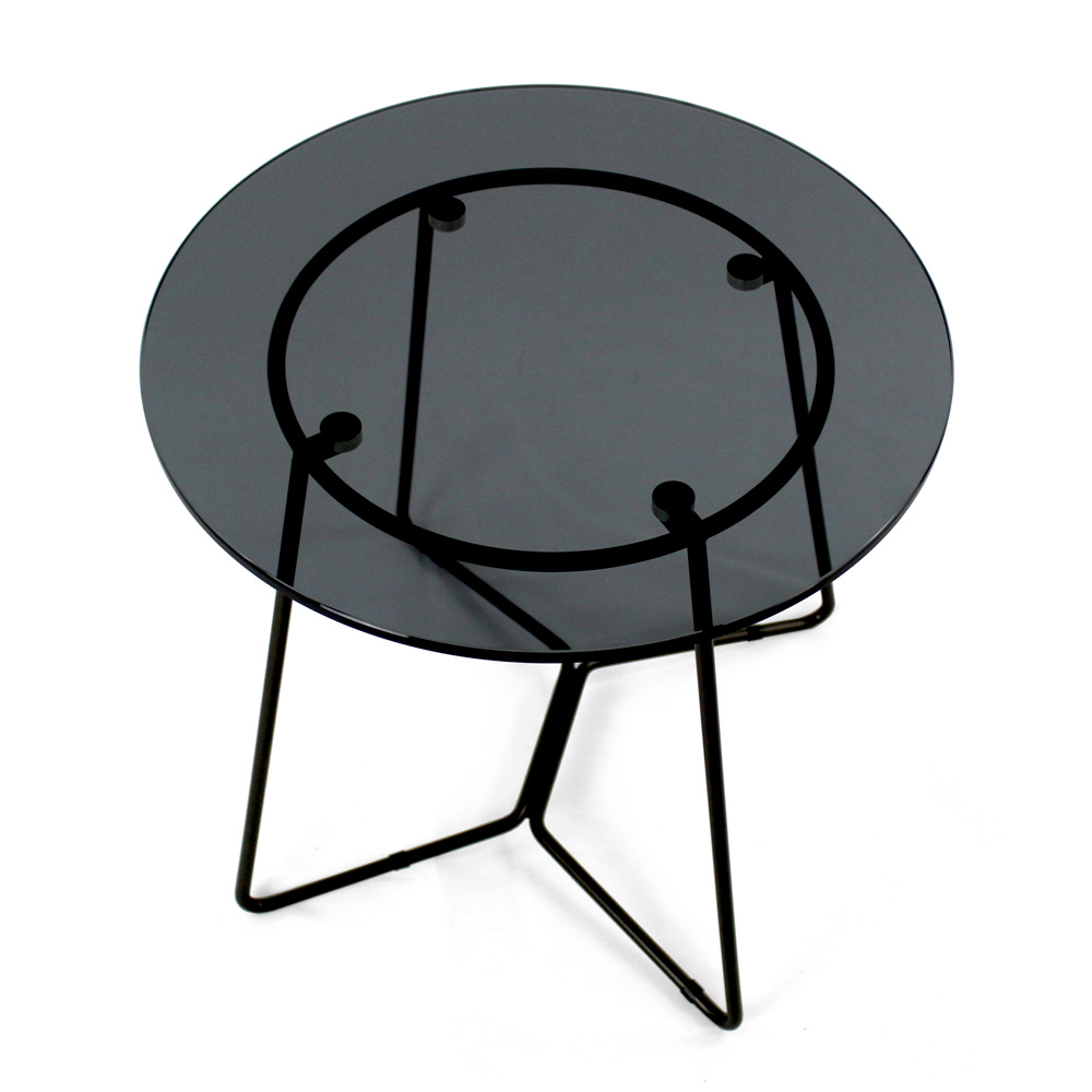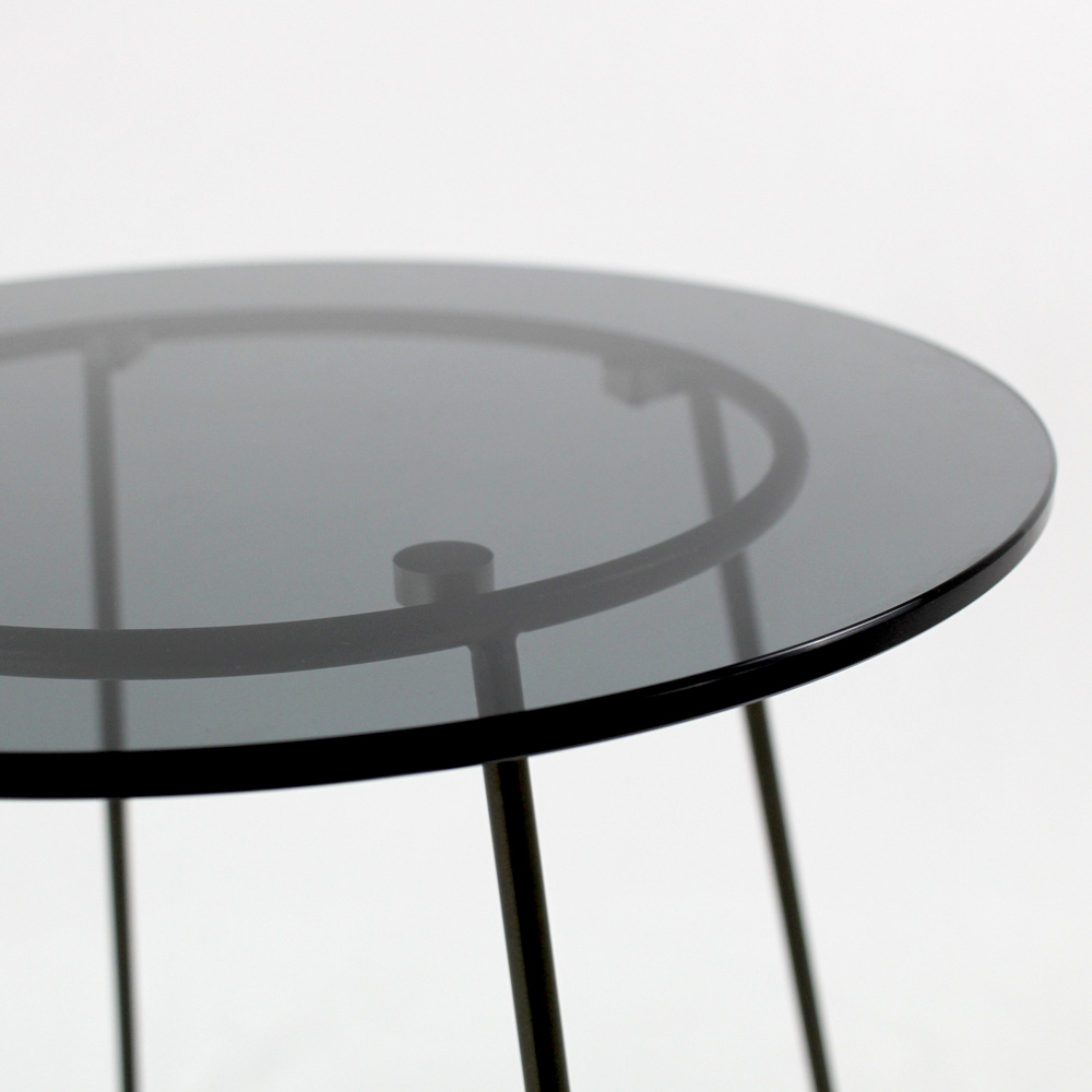 Runder Couchtisch mit lackiertem Stahlsockel und Glasplatte.