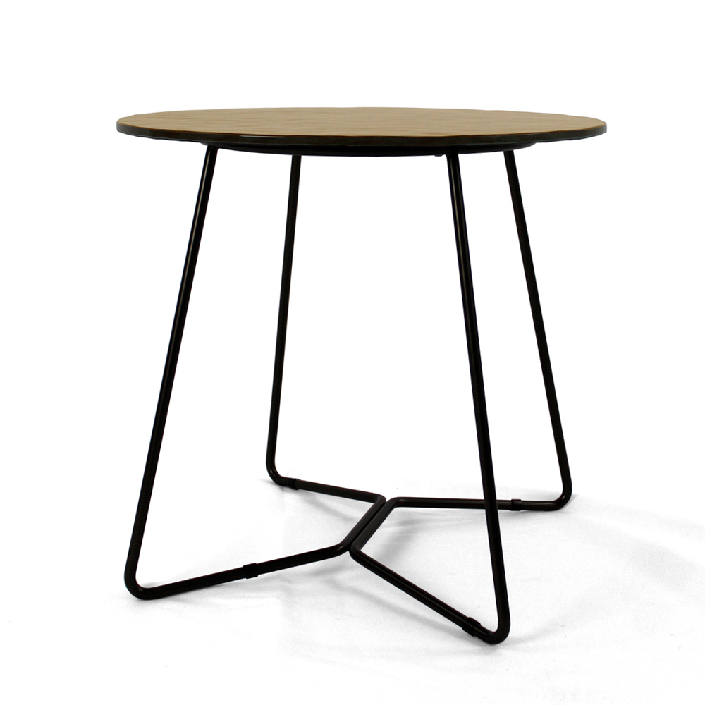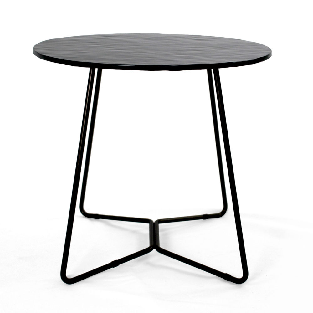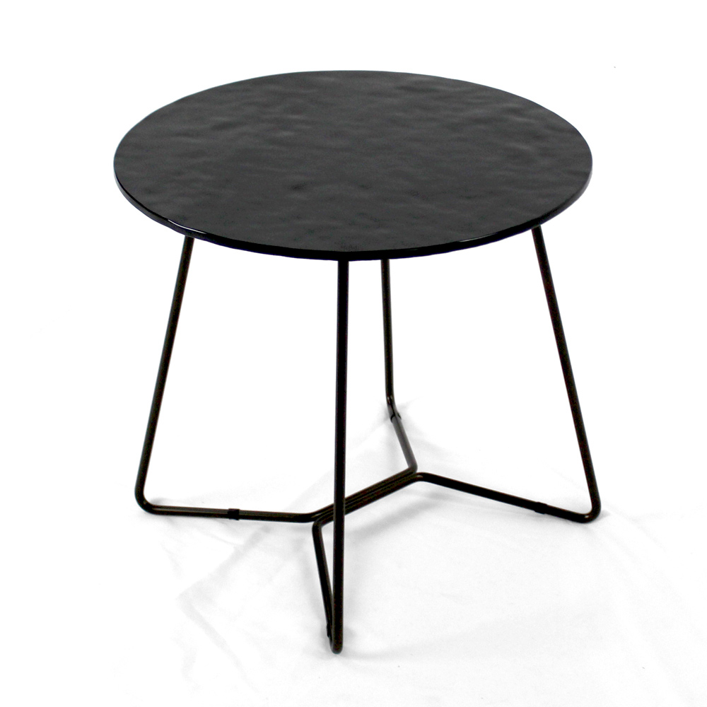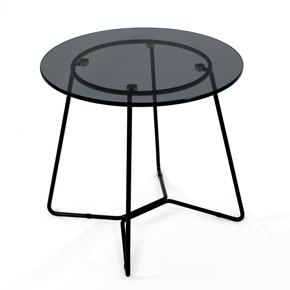 Runder Couchtisch mit lackiertem Stahlsockel und Glasplatte.