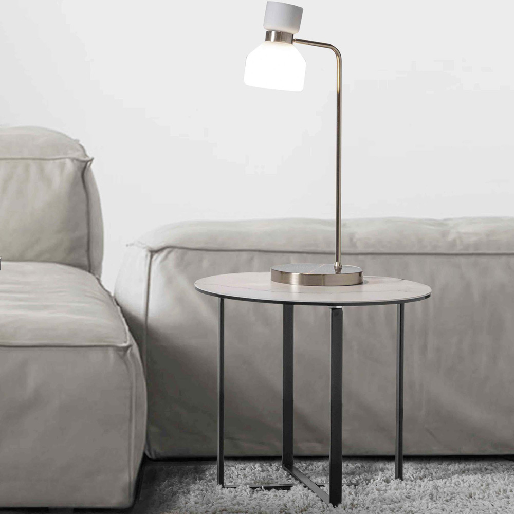 Runder Couchtisch aus Keramikglas und schwarzem Metall.