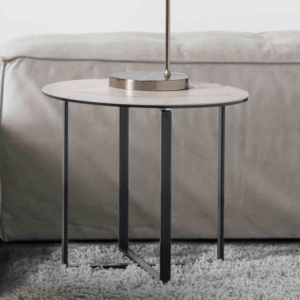 Moderner Couchtisch mit runder Platte aus Keramikglas mit weißem Marmor-Finish und schwarz lackiertem Metallfuß . Sein Design kann als schlicht und essentiell beschrieben werden, perfekt um jedes Wohnzimmer unauffällig mit modernen Möbeln zu vervollständigen. Was seinen Charme erhöht, sind die ausgewählten Materialien und Oberflächen, die es schaffen, ein besonders elegantes und nüchternes Möbelstück zum Leben zu erwecken, das das Aussehen des Raums bereichern kann, indem es als praktische Ablagefläche für Getränke, Bücher, Zeitschriften oder andere Gegenstände dient Sie griffbereit haben möchten und gleichzeitig ein raffiniertes Dekorationselement sind.