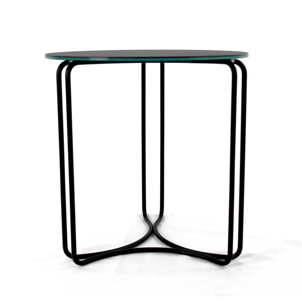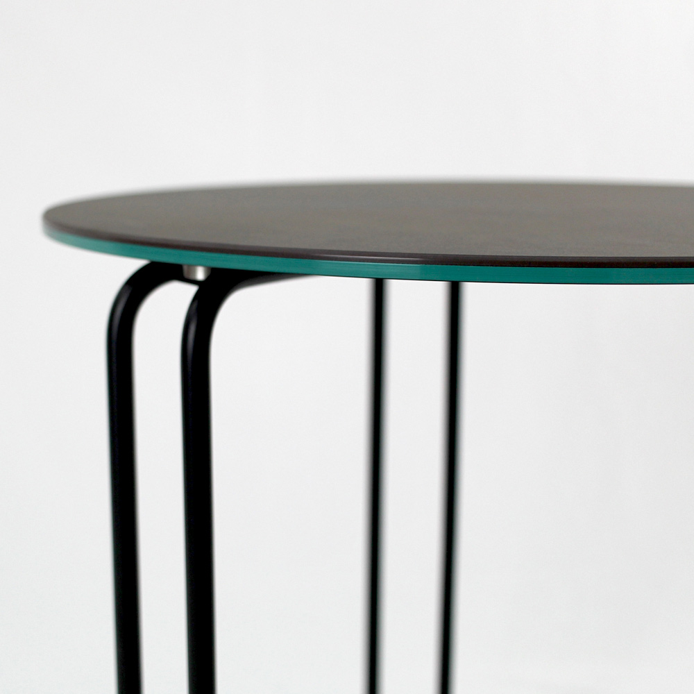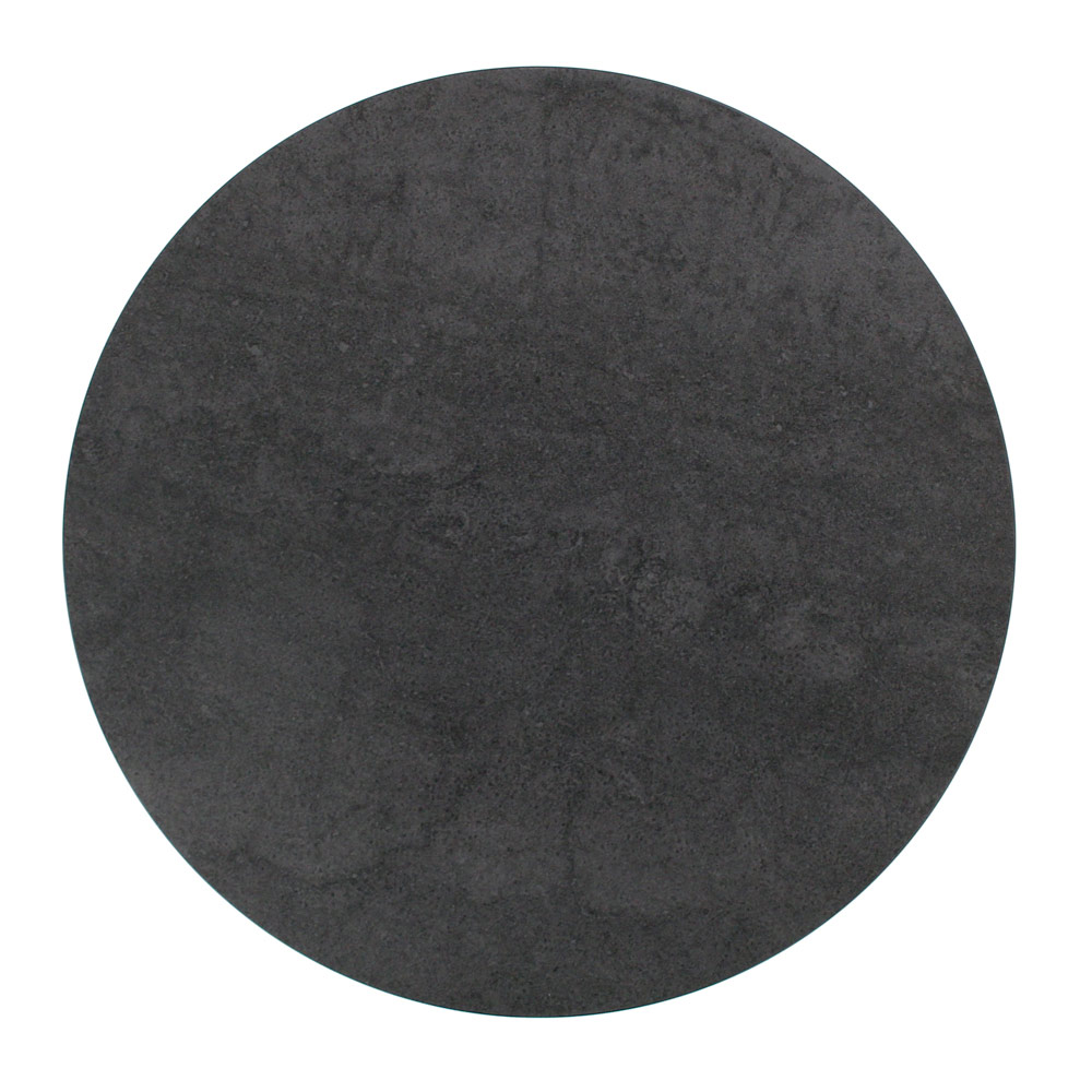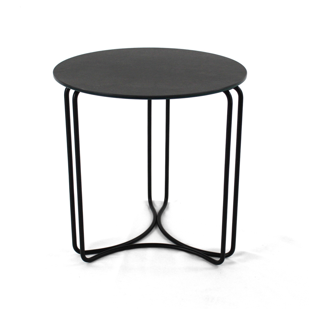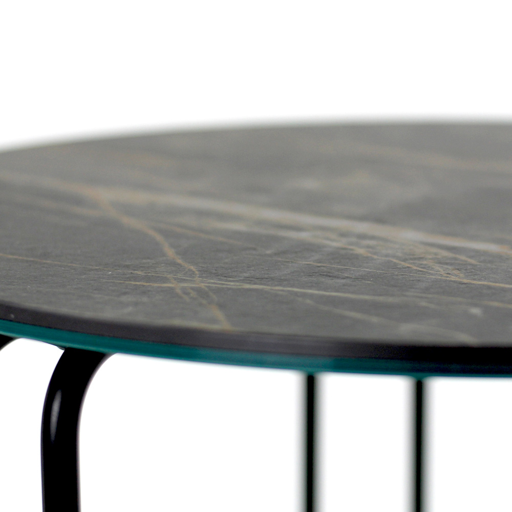 Runder Couchtisch mit lackiertem Stahlsockel und Platte aus Feinsteinzeug.